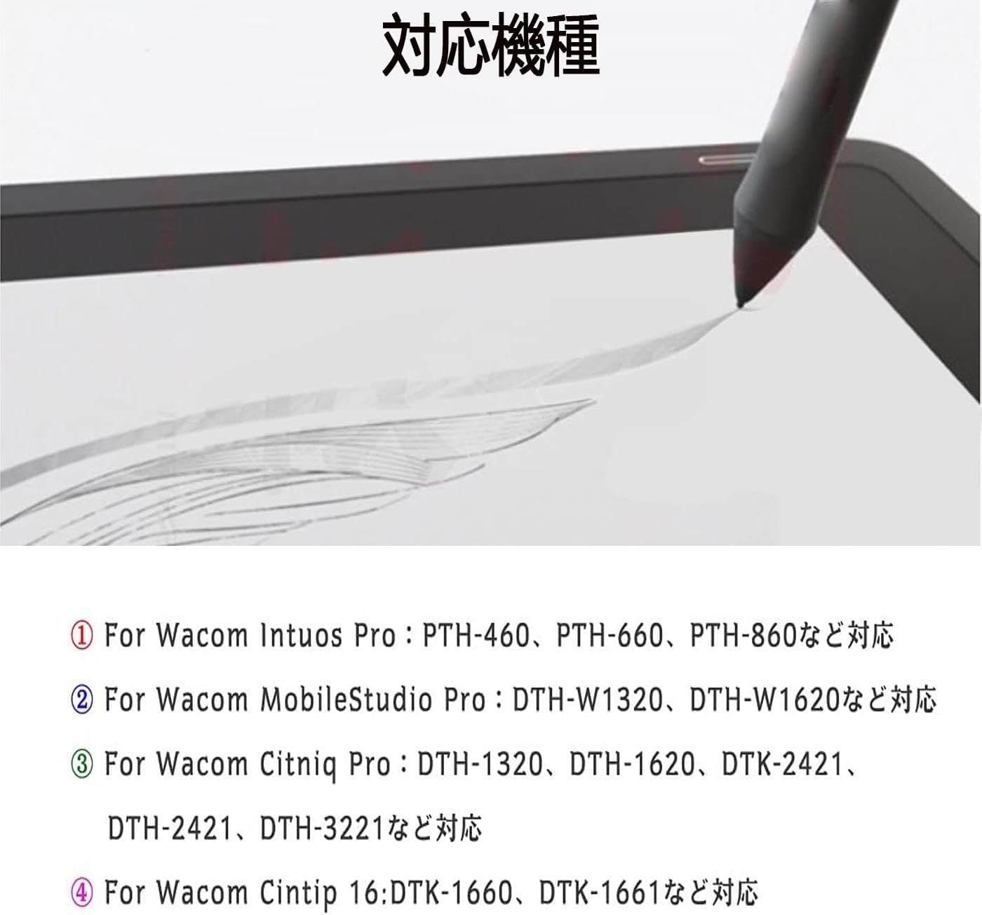 幅広い互換性のあるモデル:Wacom Intuos Proシリーズ:PTH-460、PTH-660、PTH-860などのモデルに適用する。Wacom Cintiq Proシリーズ:DTH-W 1320、DTH-W 1620などのモデルに適用する。Wacom MobileStudio Proシリーズ:DTH-1320、DTH-1620、DTK-2421、DTH-2421、DTH-3221、DTH-3221などのモデルに適用される。Wacom Cintiq 16: DTK-1660、DTK-1661などのモデルに適用する。