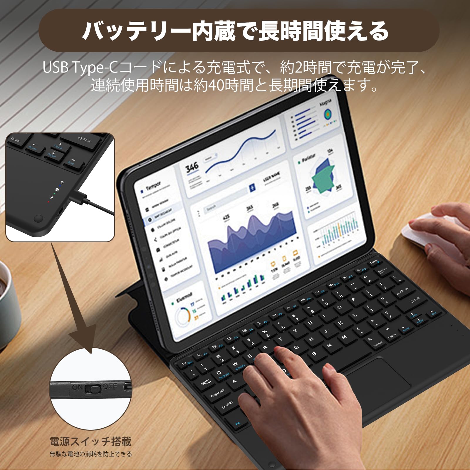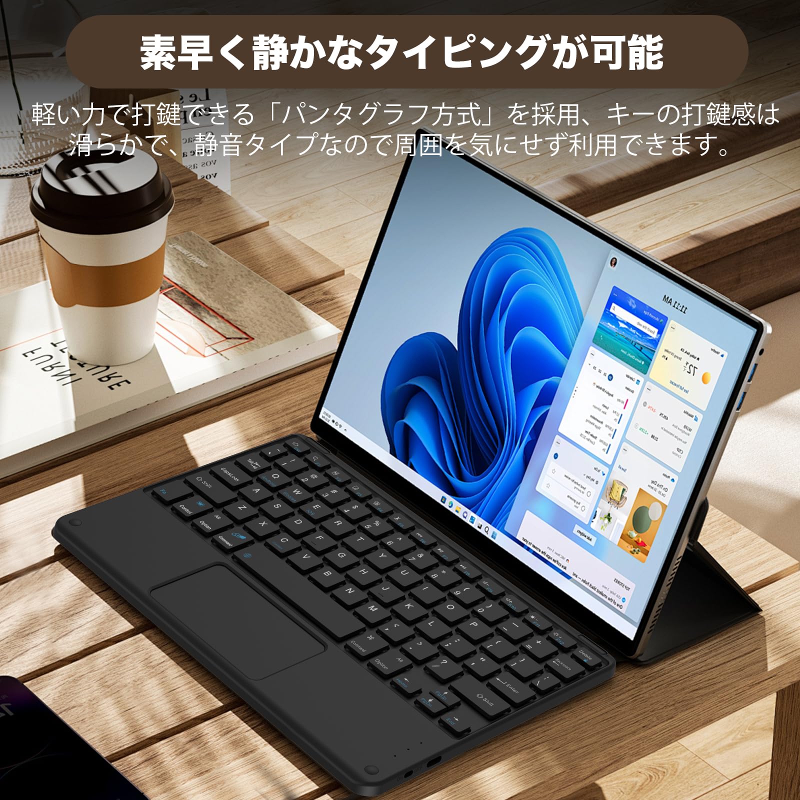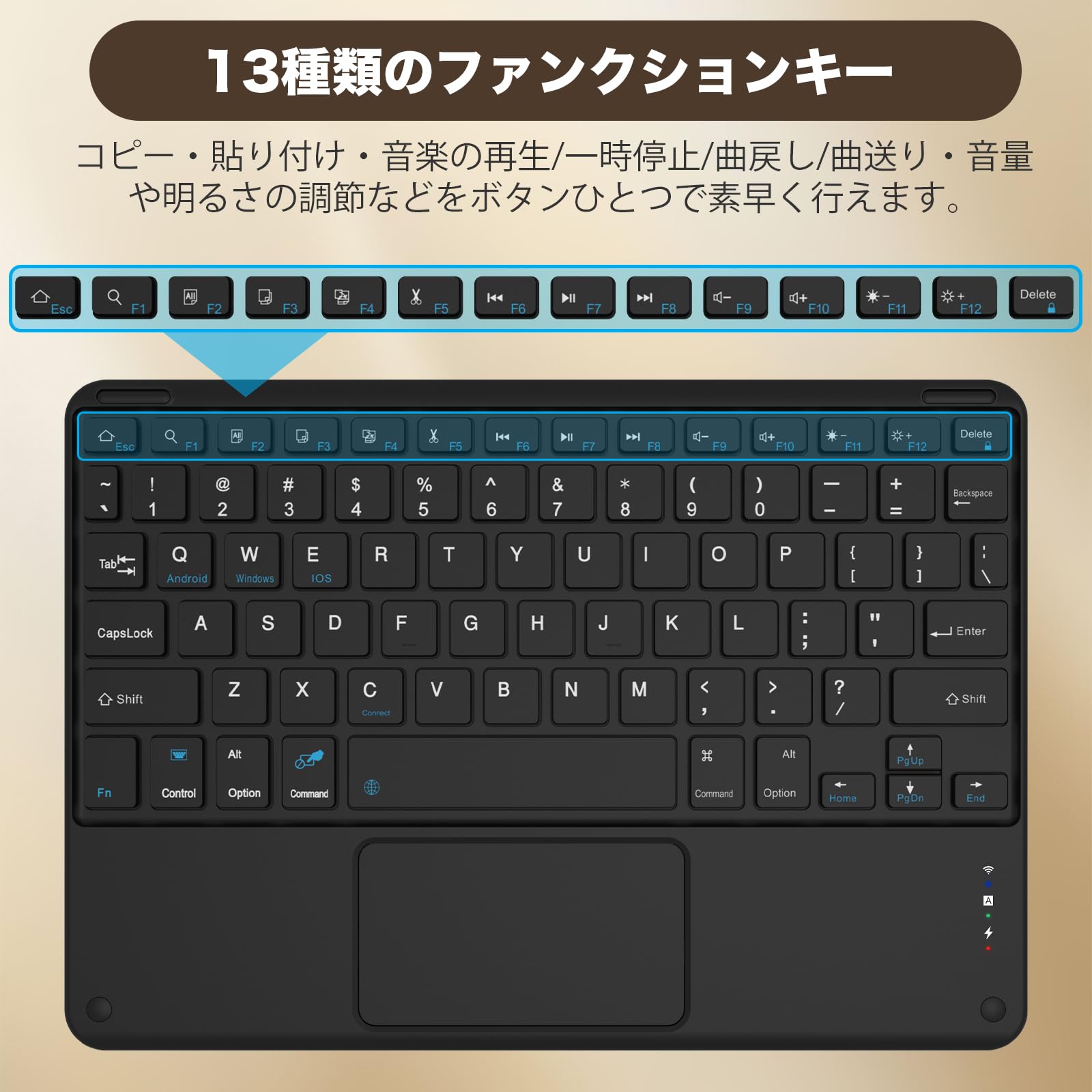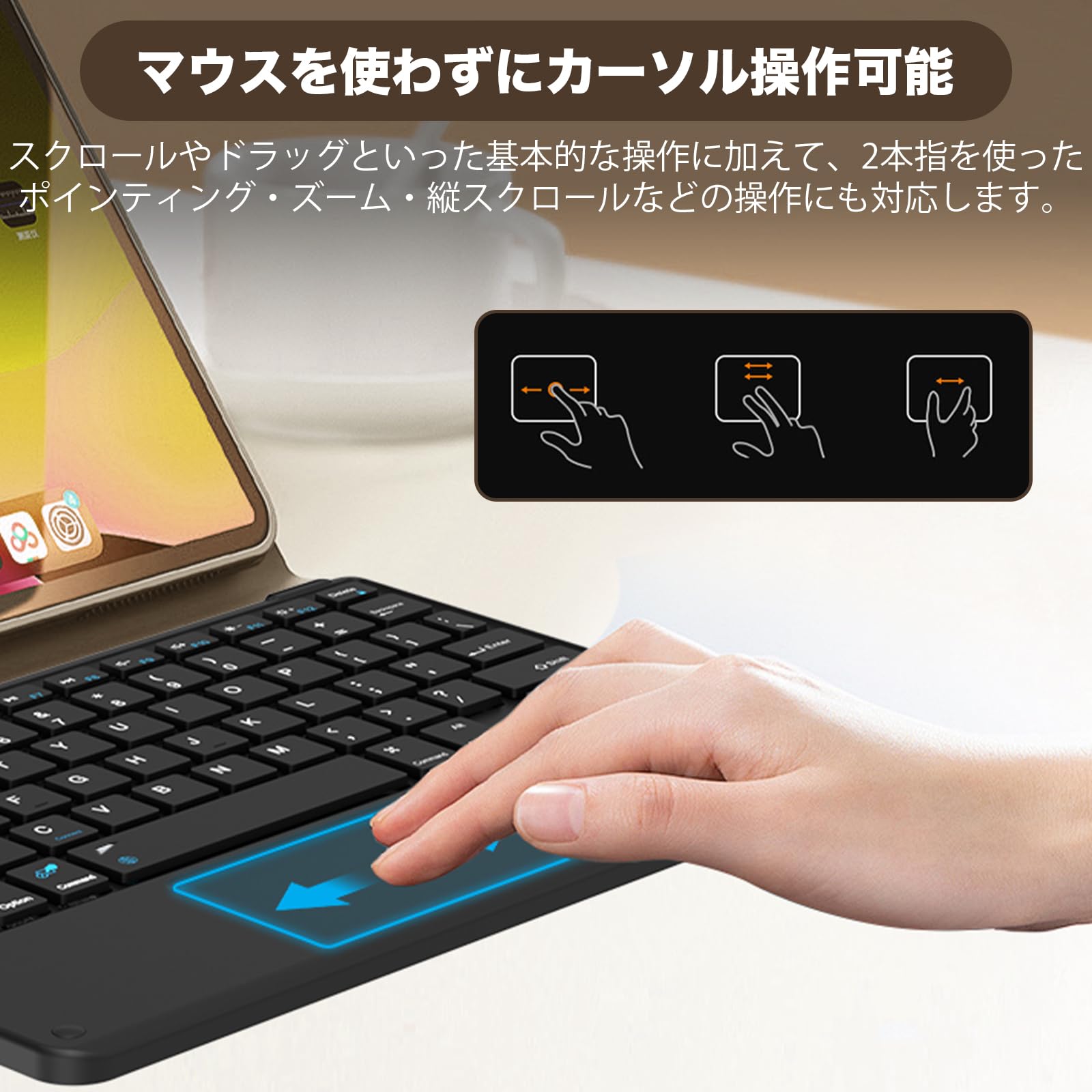 ?【タッチパッド搭載Bluetoothワイヤレスキーボード】ケーブル不要でスマートに使えるタッチパッド付き無線キーボード。マウス不要でカーソル操作ができるため、iPad、MacBook、WindowsノートPC、AndroidタブレットなどBluetooth対応デバイスにこれ1台で対応します。USBレシーバーや差し込み口が不要なので、差し替えの手間もありません。一度ペアリングすれば、次回からは自動接続されるため、面倒な設定は不要。Bluetoothキーボードを初めて使用する方にも扱いやすい設計です。薄型・軽量で持ち運びがしやすく、静音仕様のキーはカフェや図書館、オフィスなど静かな場所でも快適にタイピング可能。出張や旅行、在宅ワークにも最適なタッチパッド付き充電式ワイヤレスキーボードです。