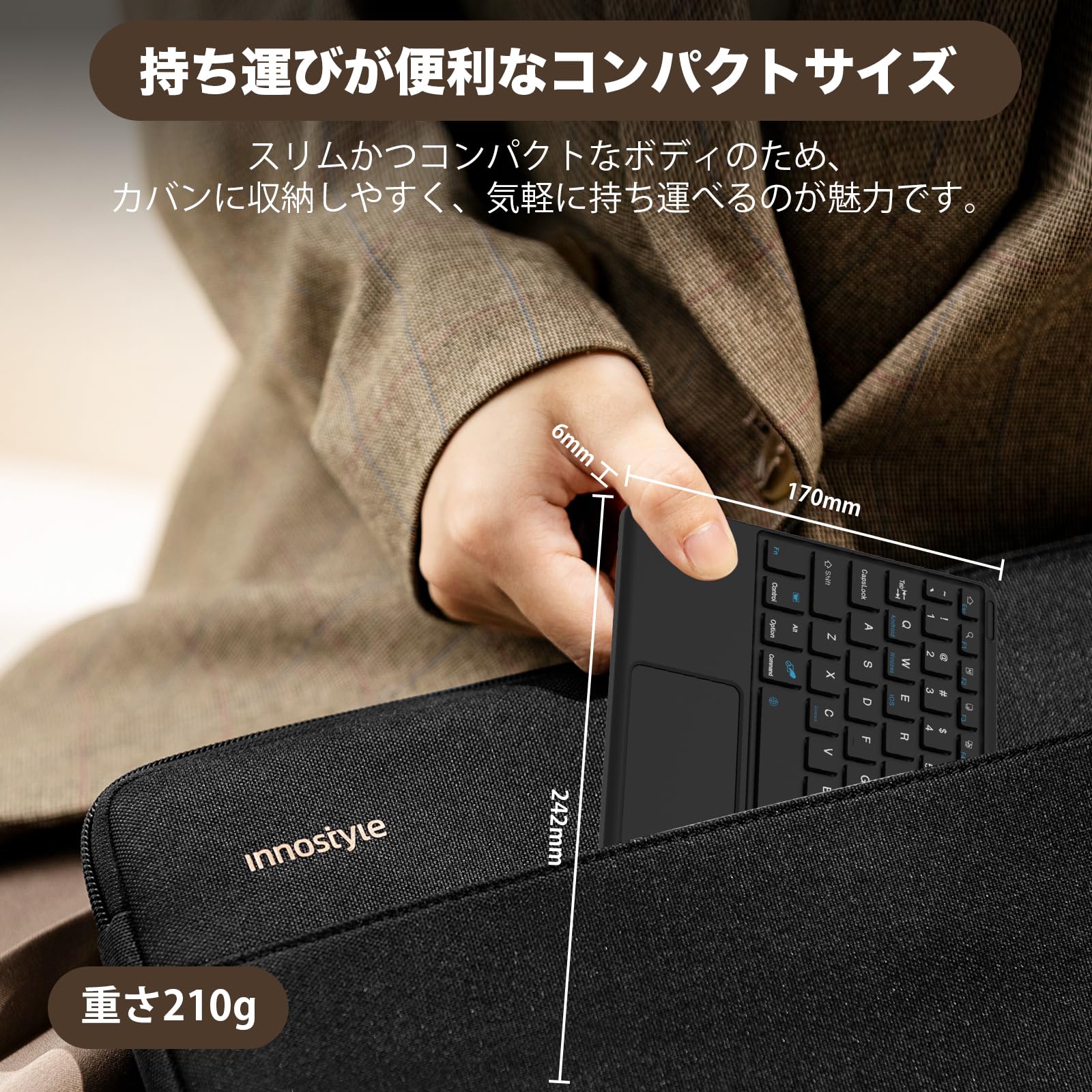 ?【スリム・軽量なタッチパッド付きBluetoothワイヤレスキーボード】薄型でスタイリッシュな本体設計を採用し、携帯性と使いやすさを両立したタッチパッド搭載の無線キーボードです。本体サイズは幅242×奥行170mm、最薄部はわずか6mmの超スリム設計。コンパクトサイズのため、カバンやリュックのポケットにもすっきり収まり、出張や旅行、外出先での使用に最適です。重さはわずか210gと軽量で、長時間の持ち運びでも負担になりません。Bluetooth接続でiPad、MacBook、WindowsノートPC、Androidタブレットなど幅広いデバイスに対応。薄型・軽量・静音仕様で、カフェや図書館、オフィスなど様々な環境で快適に使用できるコンパクトキーボードです。