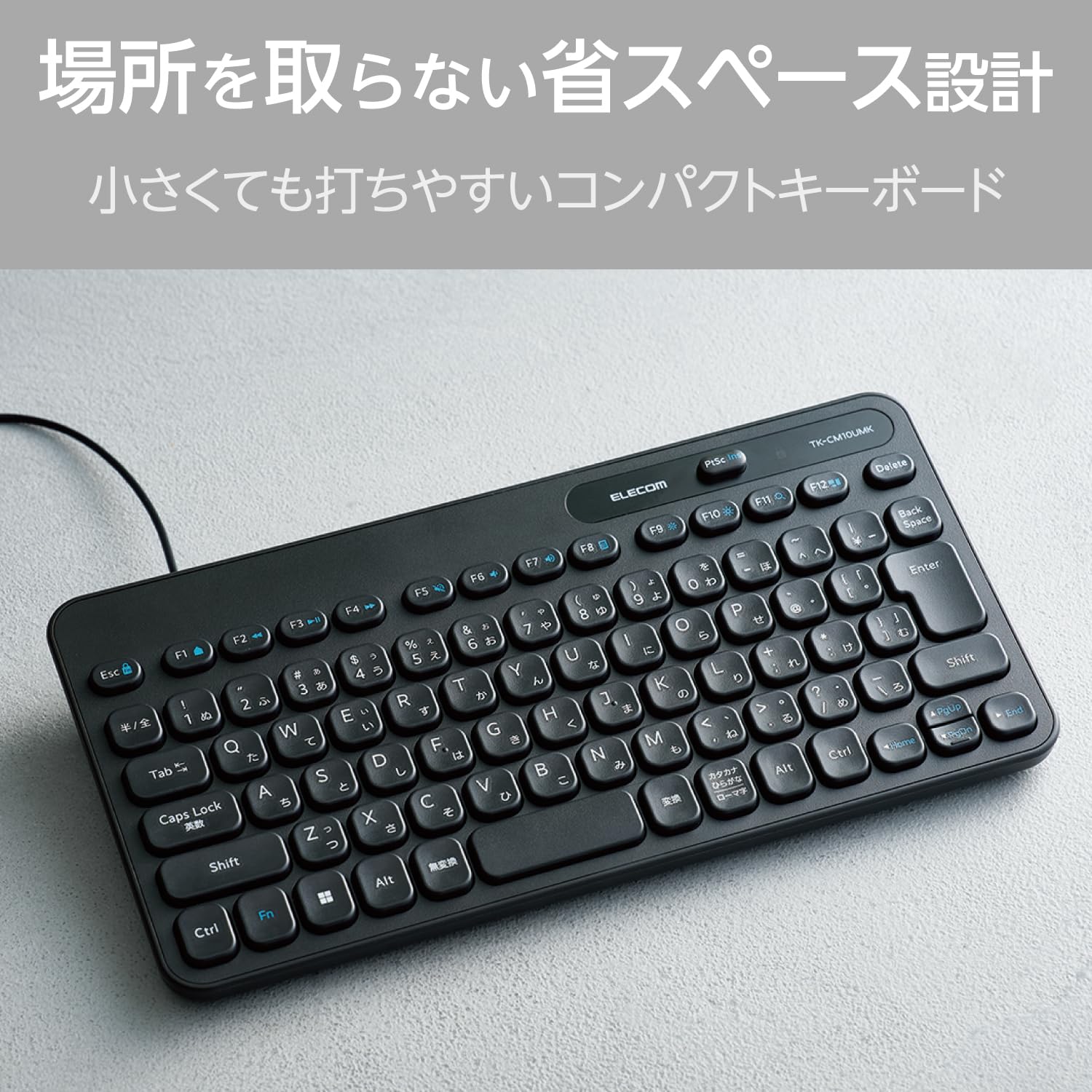 一般的なテンキーレスキーボード(キーピッチ19mm)と比較すると約25%も小型化。狭いデスクや限られたスペースでの使用や、2台目のパソコン用に適しています。