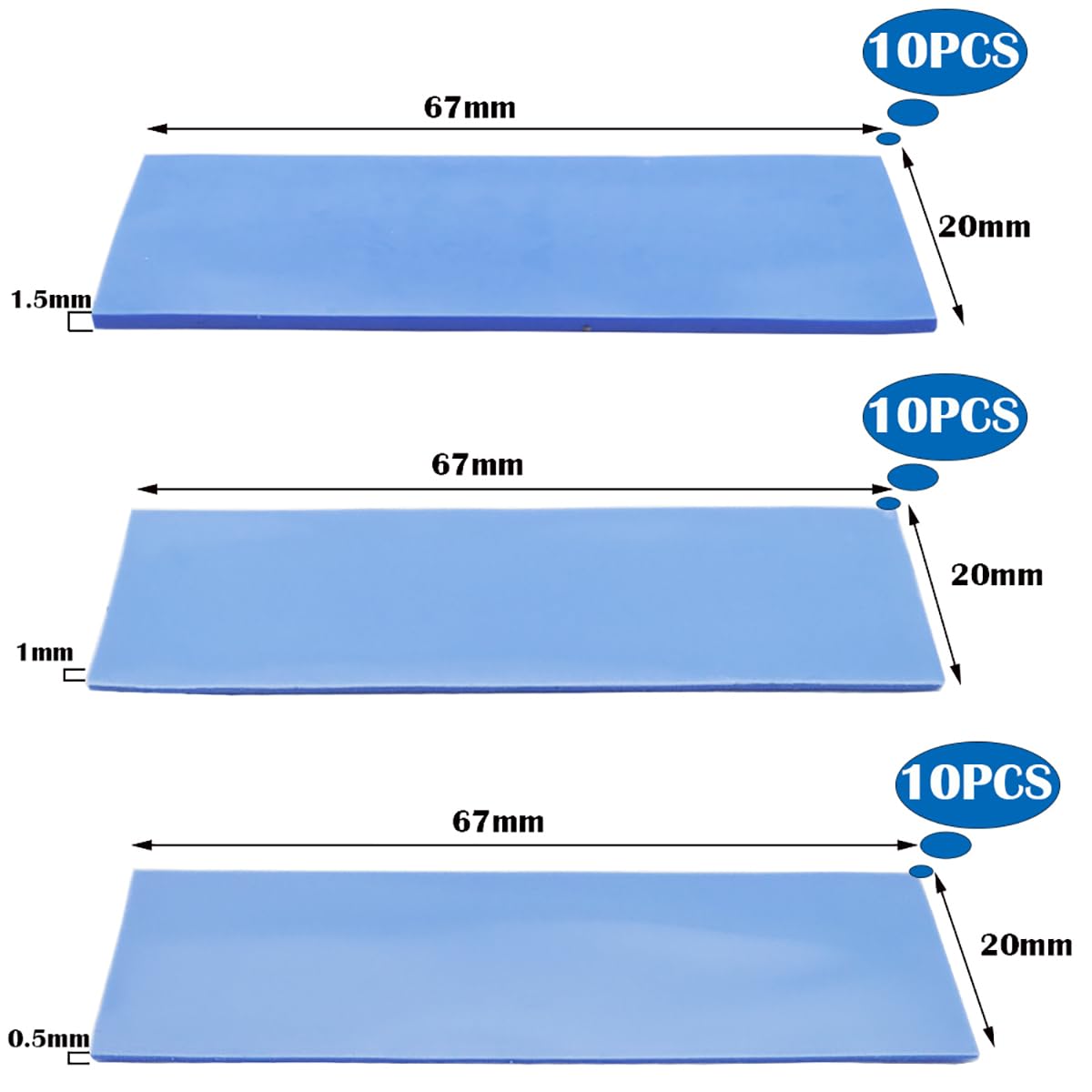 ?パッケージ:サーマルパッド、カラー:ブルー、3サイズ:20x67x0.5mm * 10個、20x67x1.0mm * 10個、20x67x1.5mm * 10個