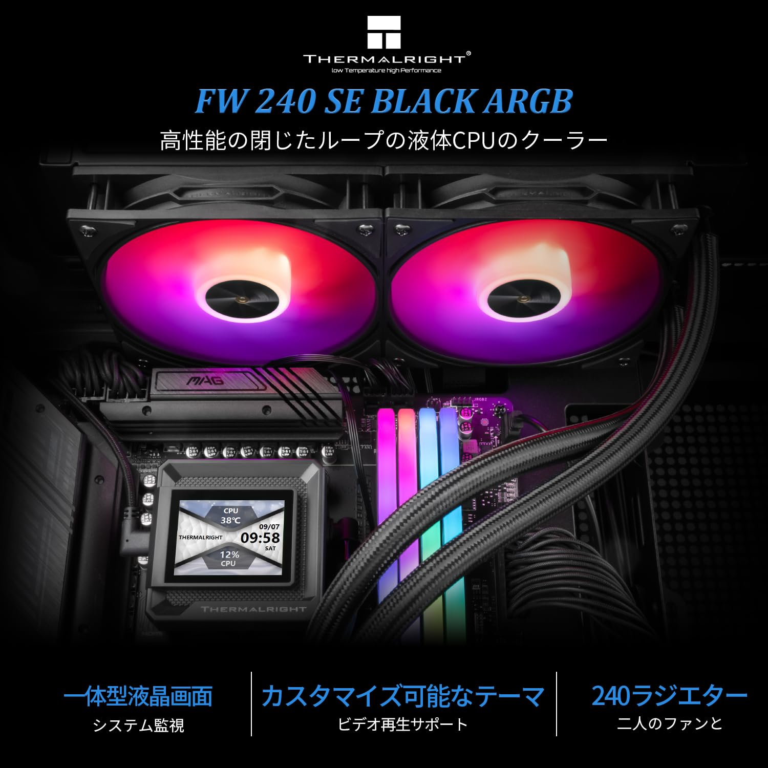 Thermalright FW SE 240 ARGB Black CPU AIO クーラー、PC 240 仕様ウォーター クーラー システム、320*240 解像度の IPS LCD スクリーン、AM5、Intel LGA1700/1851、CPU クーラーには 2 インチ LCD ディスプレイが付属しています