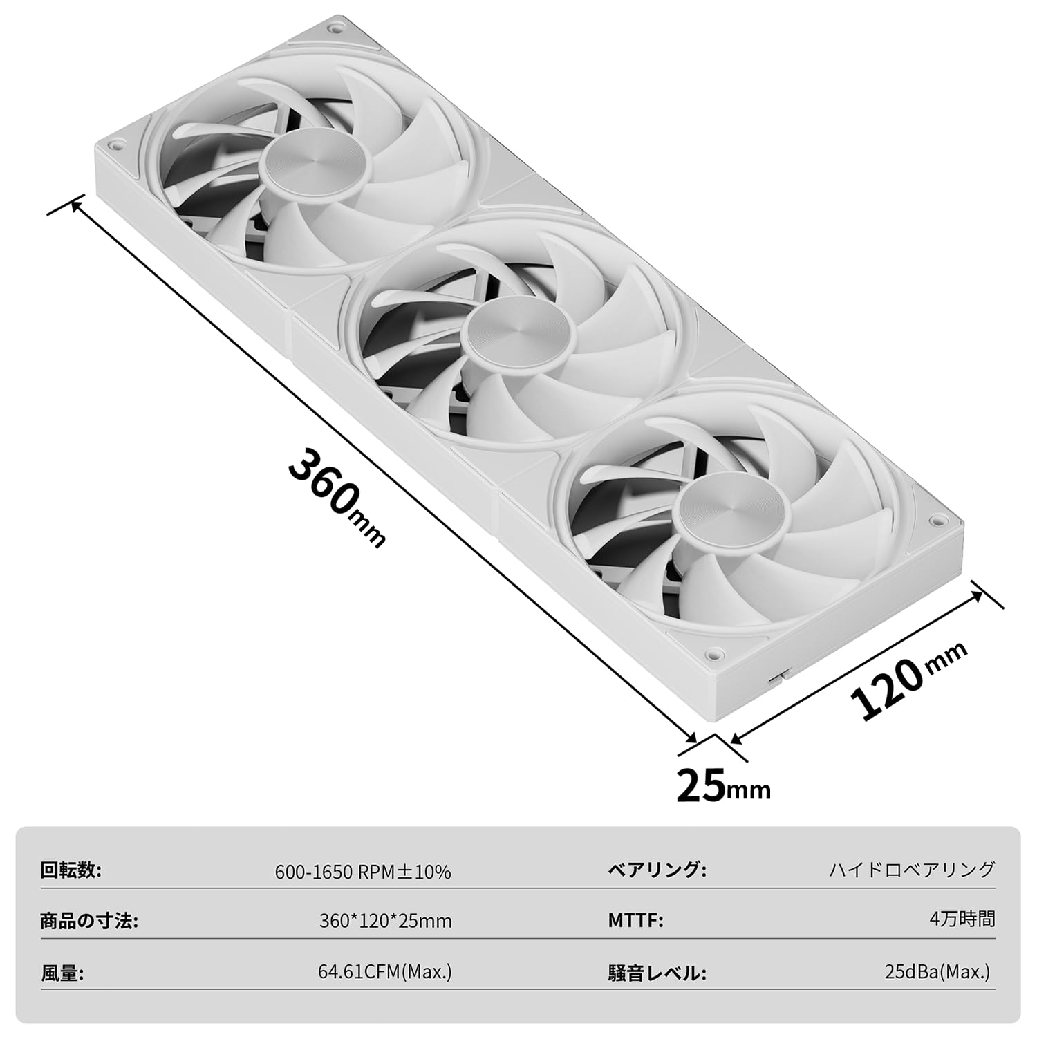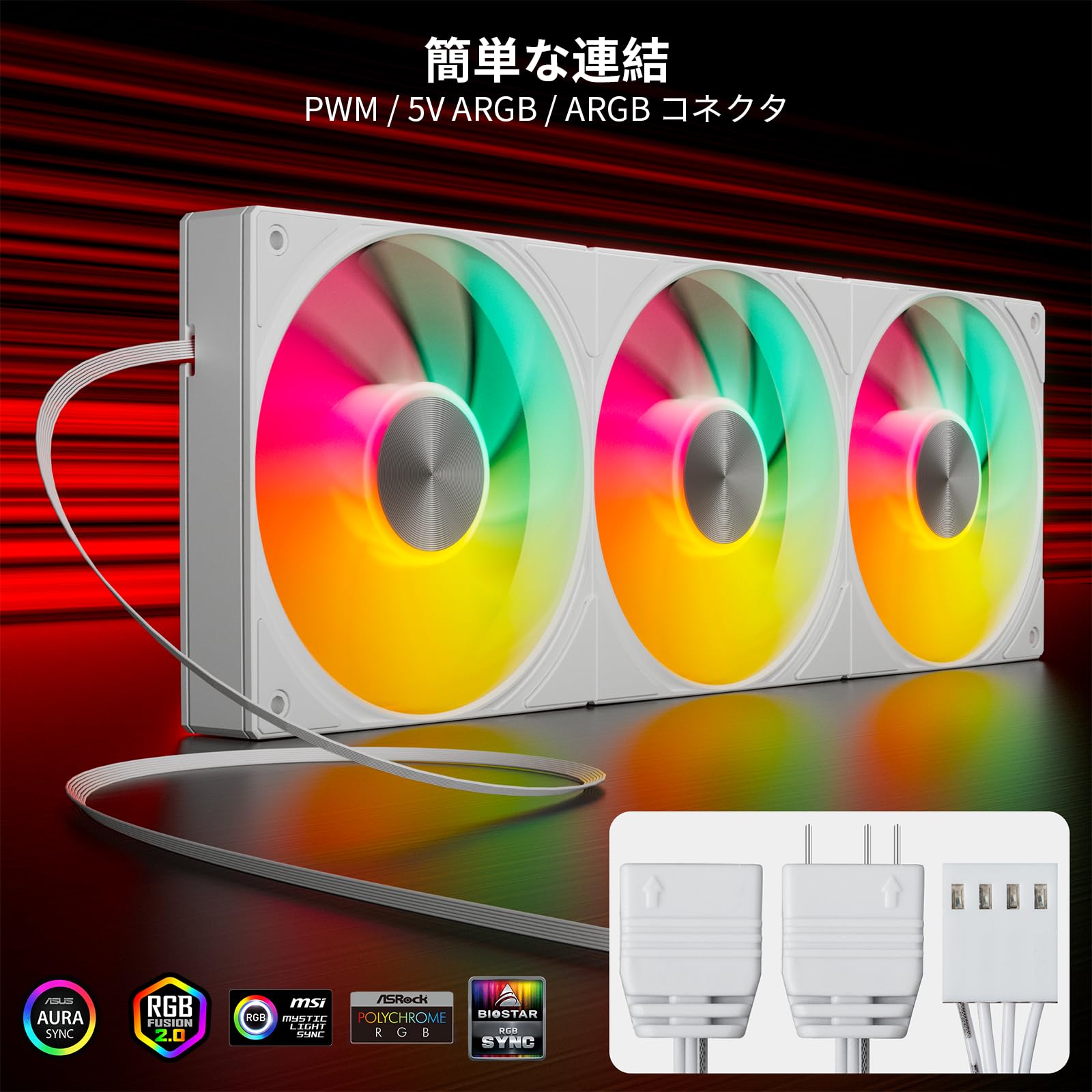 upHere PCケースファン 360mm 連結型 5V3ピンARGB pc冷却 12cm cpuファン 4ピン デイジーチェーン対応 静音 PWM 600-1650RPM DC12V 白い【U3TC3】