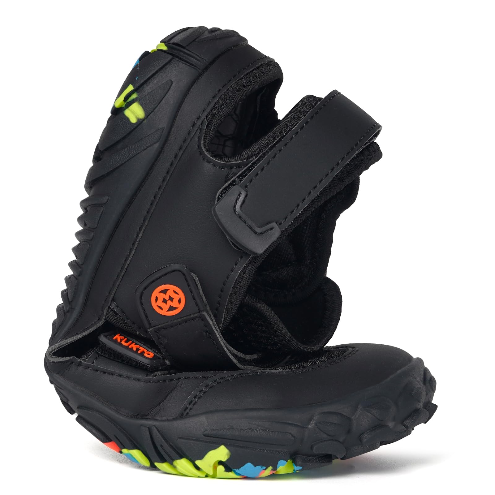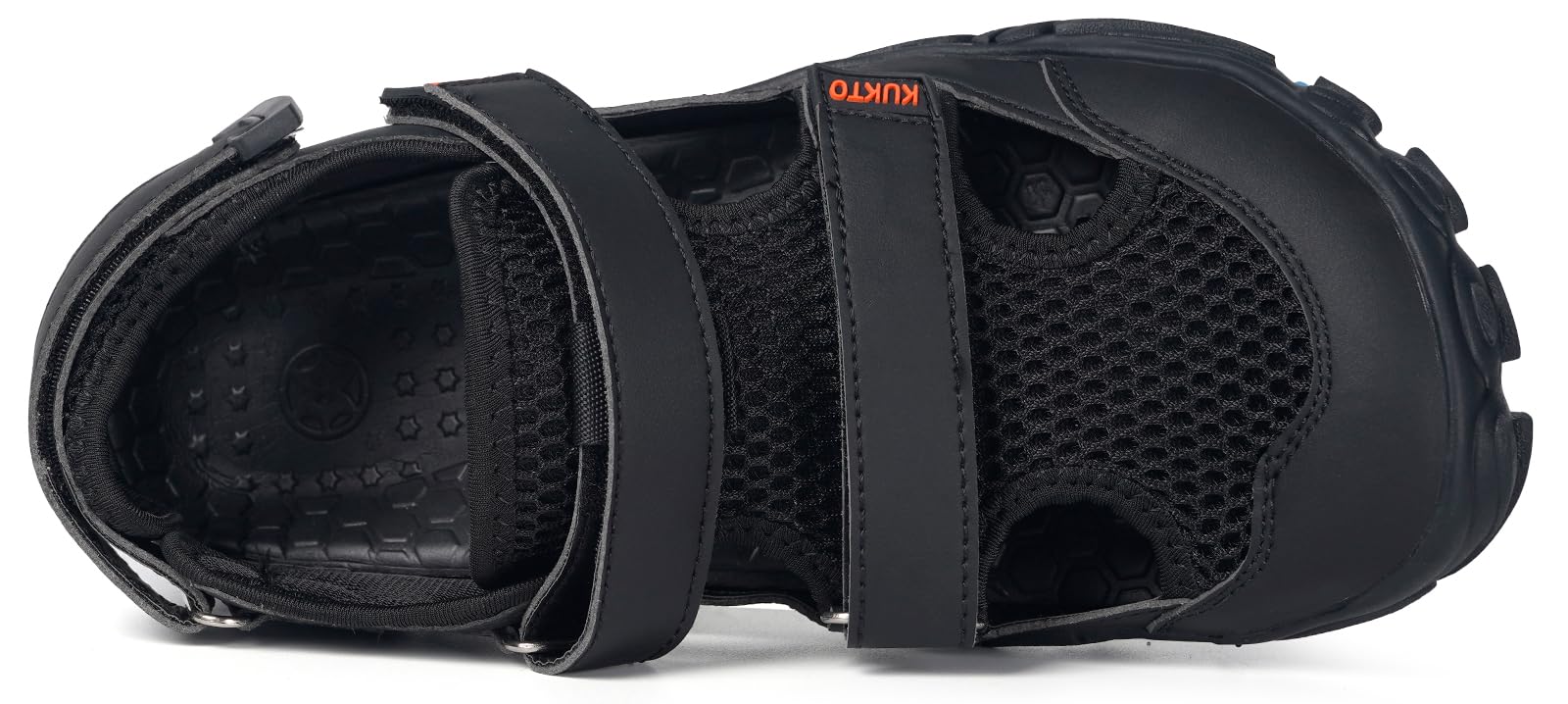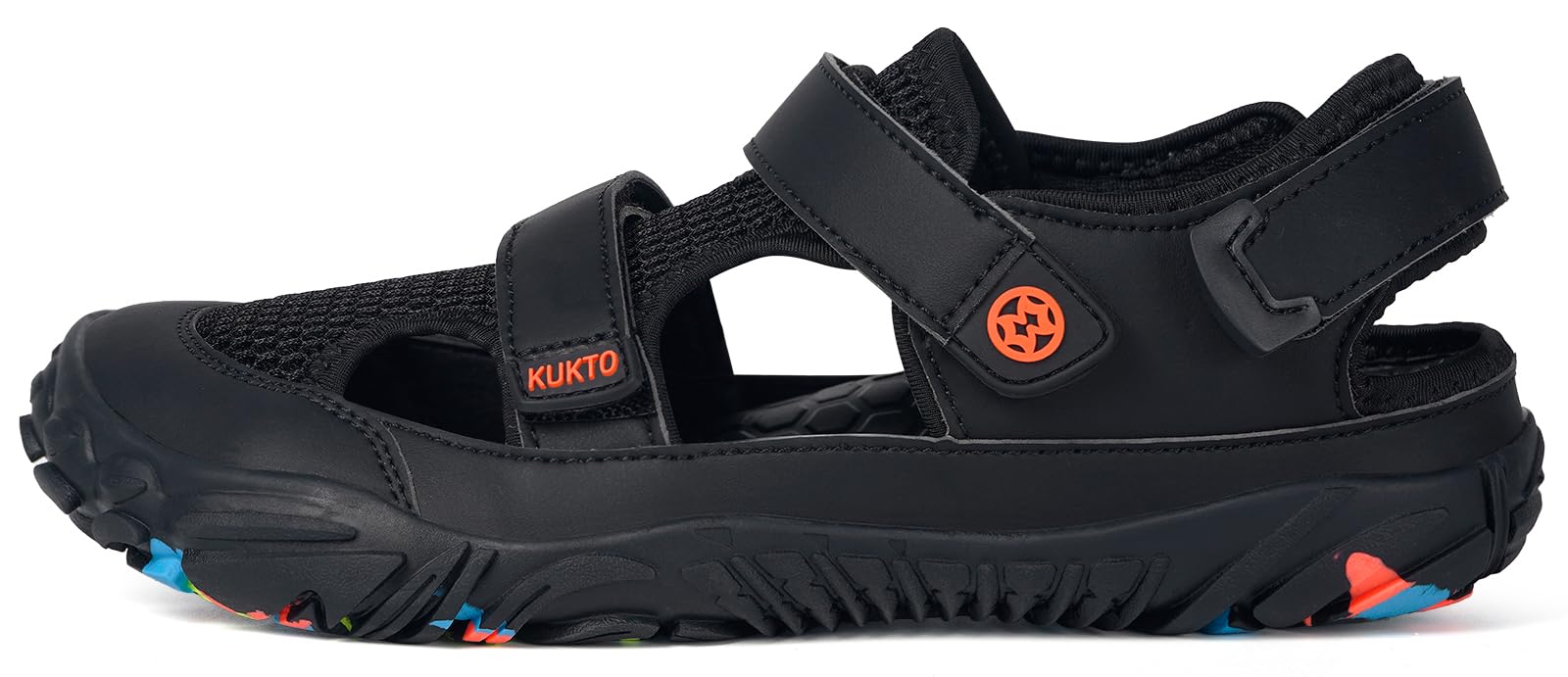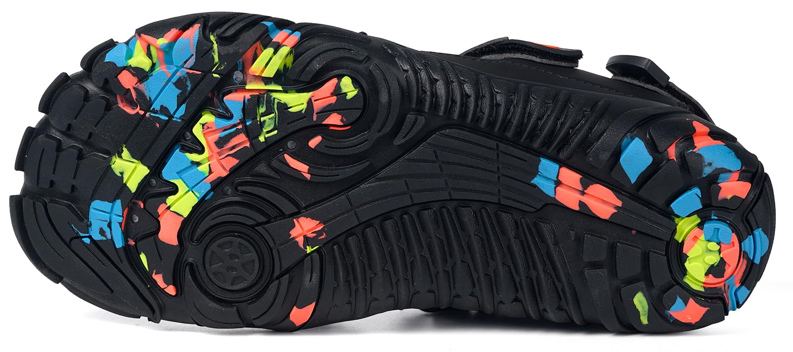 【履きやすい】ワイドトゥボックスで、つま先を圧迫しにくい。甲側とカカトと、3ヶ所のマジックテープでフィット感に応じて調整できて、着脱しやすいし、足形にもフィットしています。