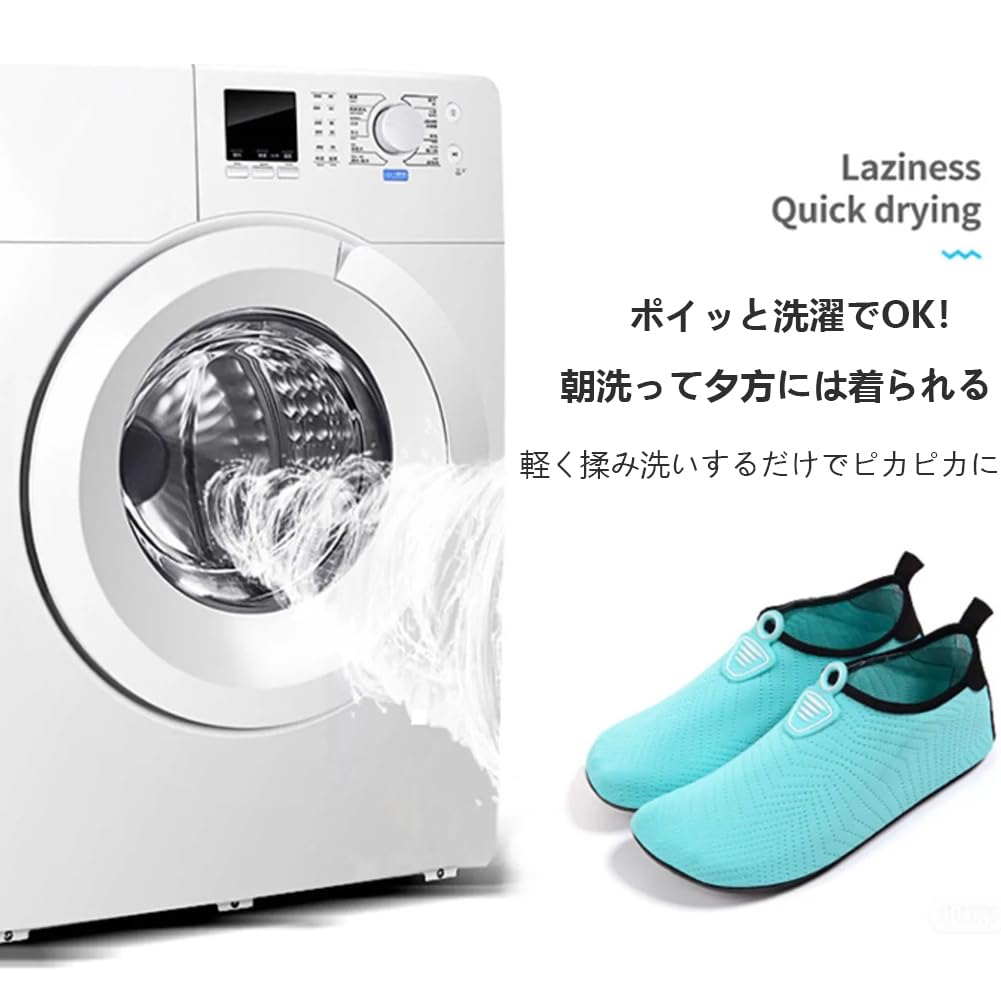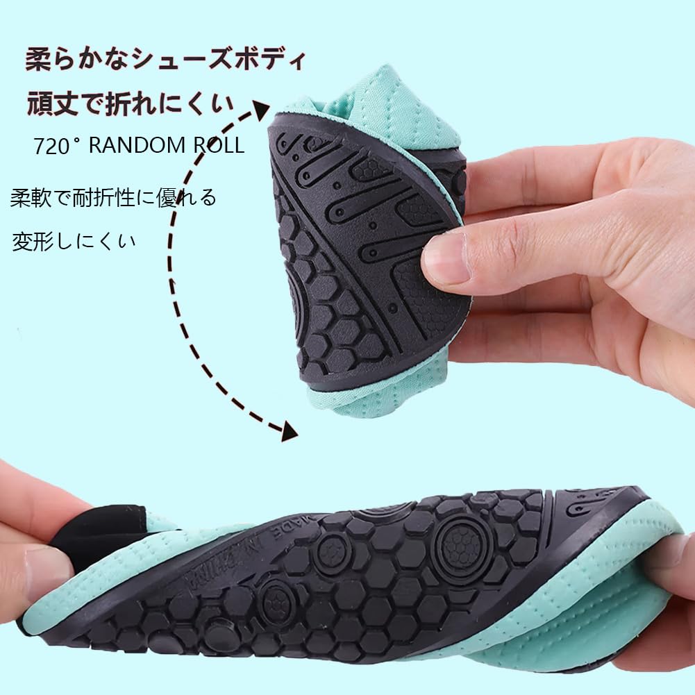 【柔らかい素材、快適】柔らかい素材を使って、軽量で履き心地が良いです。弾力性、通気性に優れたメッシュ素材のウォーターシューズ!速乾性があり、汚れても気軽に洗えてすぐ乾きます。柔軟性が非常によくて、360度自由に曲げることが可能で、靴下のようにぐるぐる丸めてコンパクトに収納できます。また、丈夫で滑りにくいゴム底なので、強力なグリップ力です。