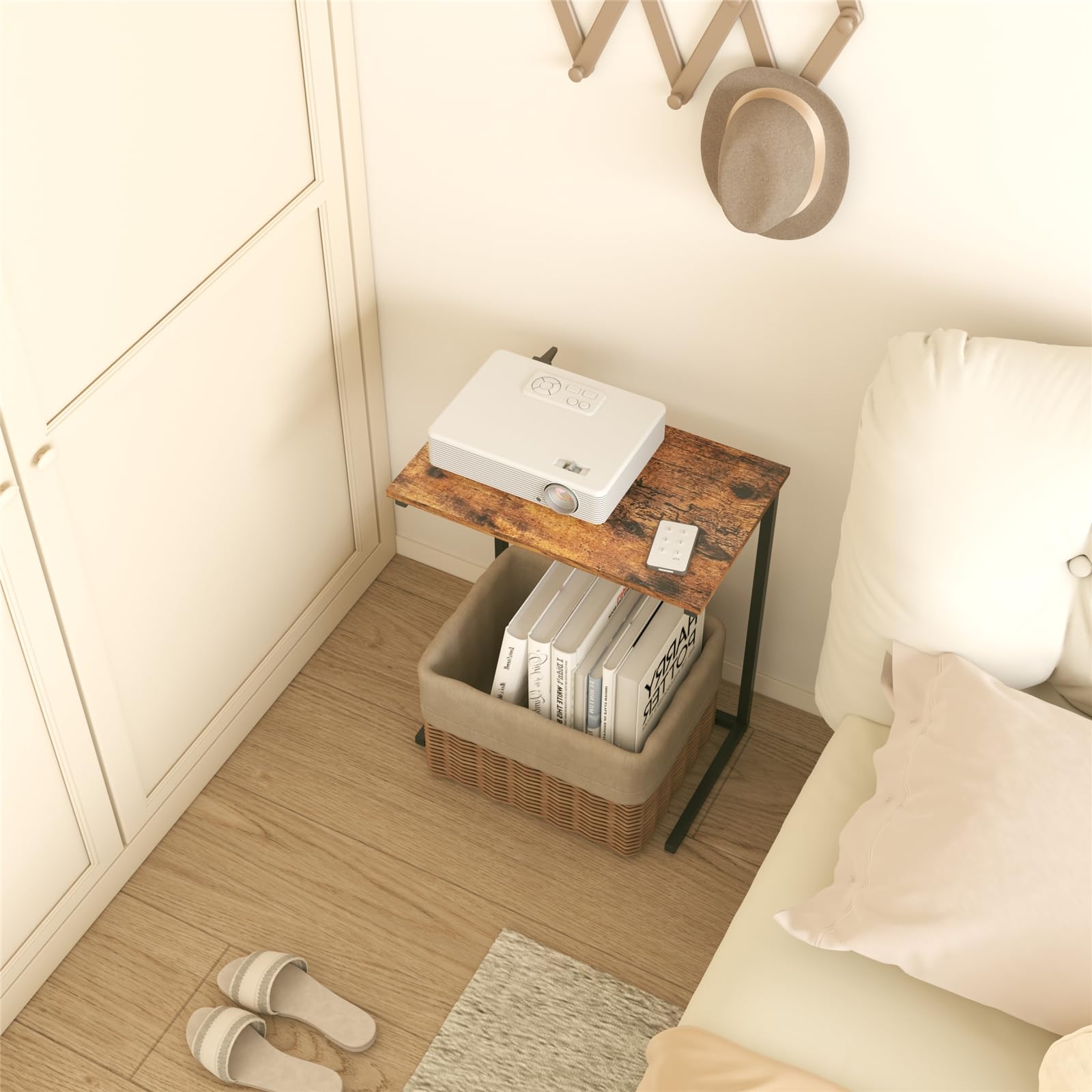 【人気】テーブル サイドテーブル 幅55×奥行35×高さ65cm ナイトテーブル コの字型デザイン 木目調 ベッドサイド ベッド横 ソファ横 組立簡単 在宅勤務 多機能 (ヴィーンテージ)