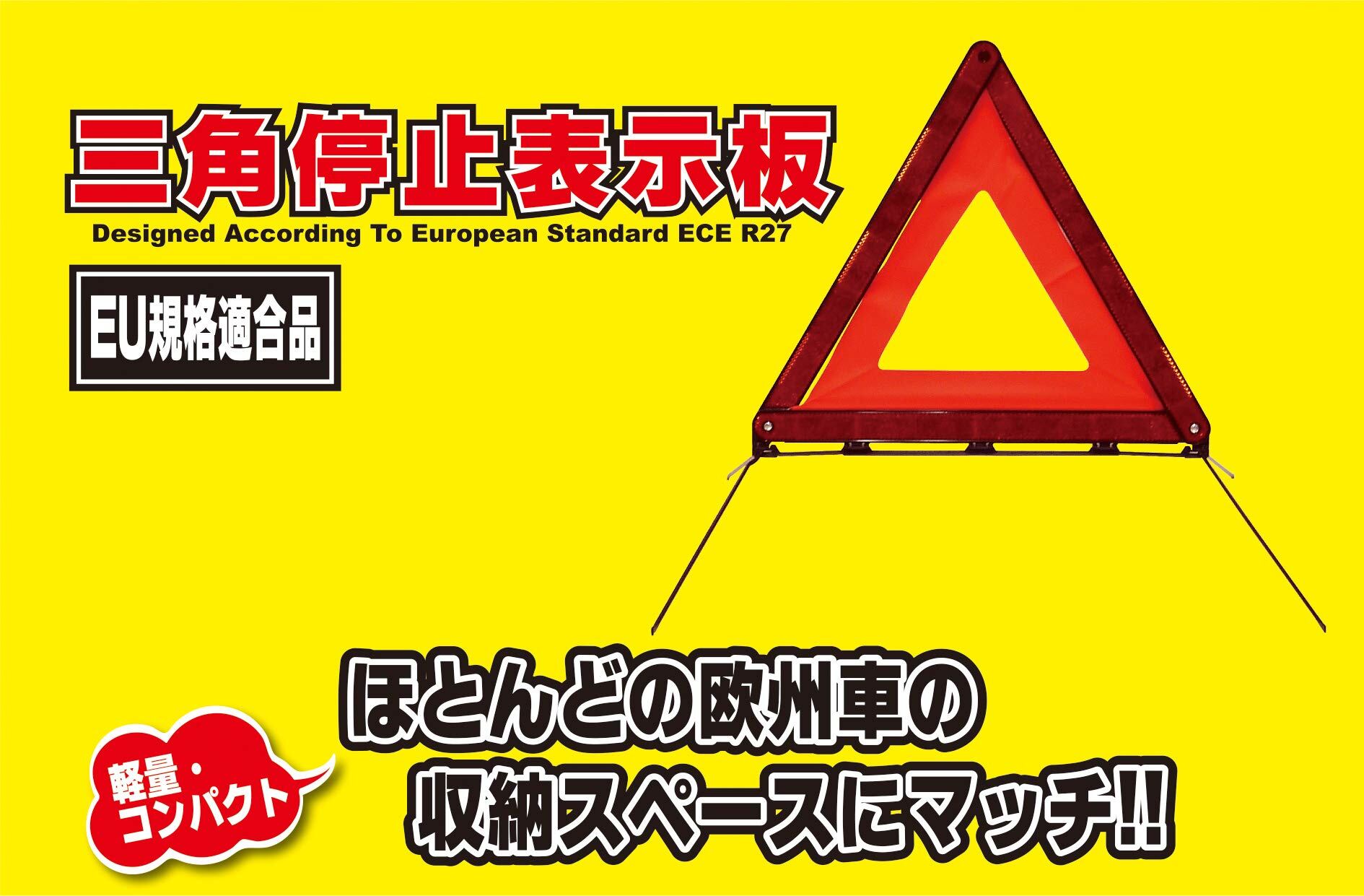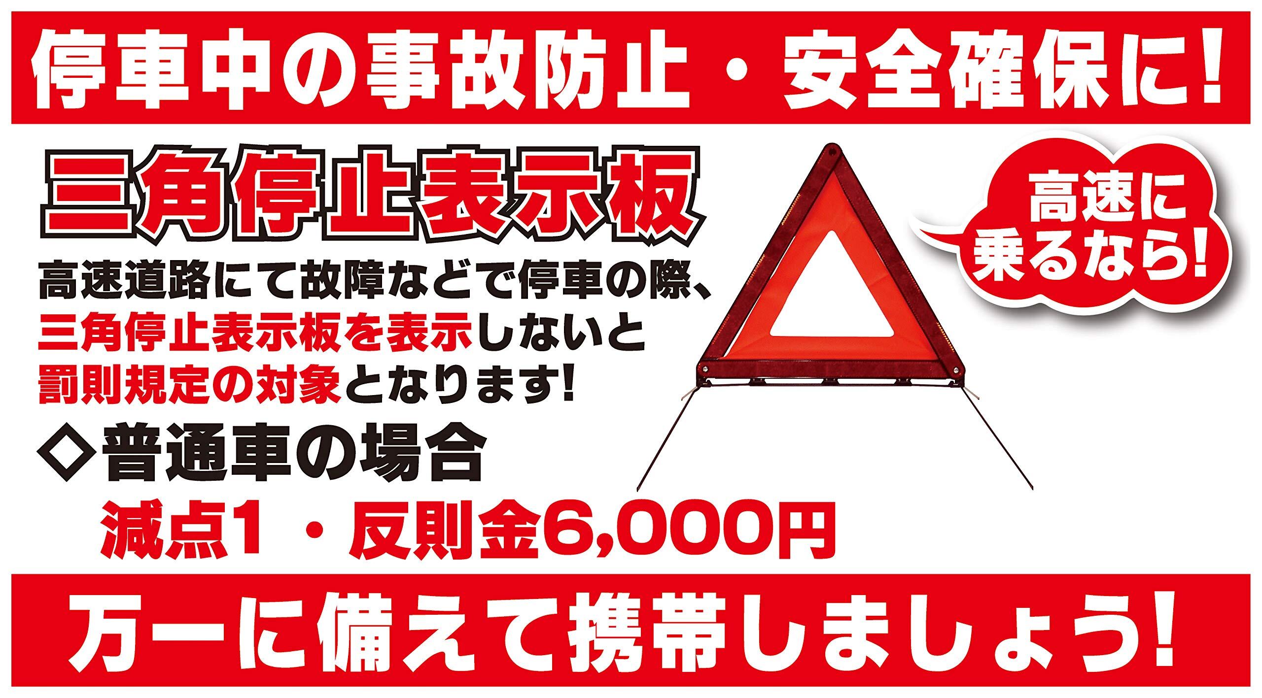 ●車の非常事態に備えて安心の三角停止表示板! 高速道路や自動車専用道路等で車を停止せざるを得ない場合、三角停止表示板を表示していないと、道路交通法違反となります! 1台に1つ常備しておきましょう。※故障車両表示義務違反:減点1・反則金/普通自動車6,000円