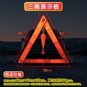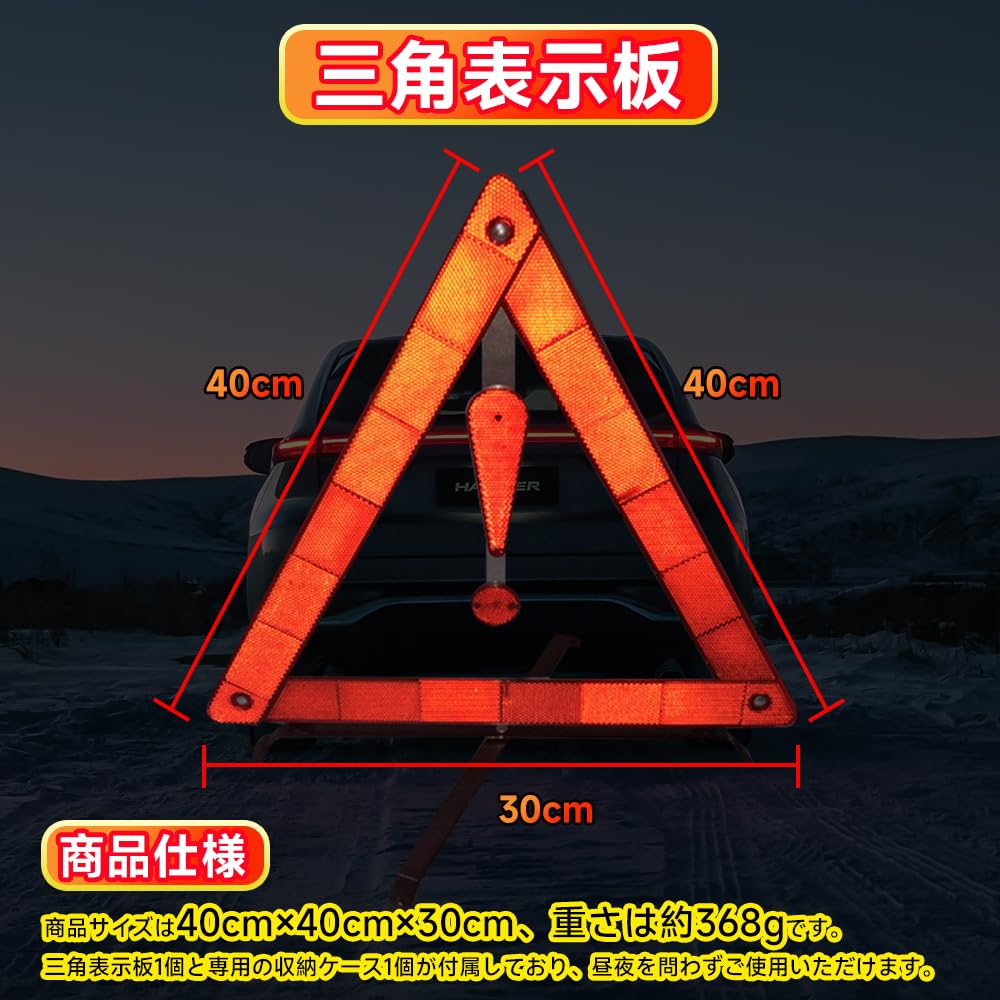 【商品仕様】商品サイズは40cm×40cm×30cm、重さは約368gです。三角表示板1個と専用の収納ケース1個が付属しており、昼夜を問わずご使用いただけます。