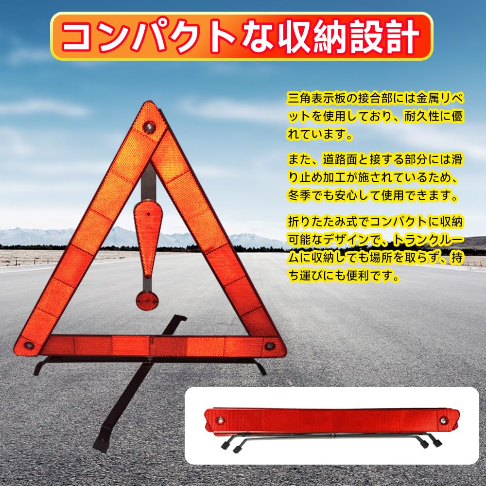 【コンパクトな収納設計】三角表示板の接合部には金属リベットを使用しており、耐久性に優れています。また、道路面と接する部分には滑り止め加工が施されているため、冬季でも安心して使用できます。折りたたみ式でコンパクトに収納可能なデザインで、トランクルームに収納しても場所を取らず、持ち運びにも便利です。