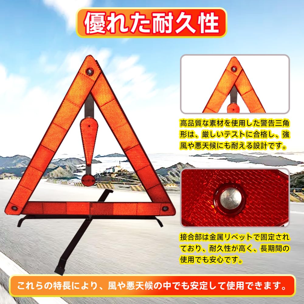 【優れた耐久性】高品質な素材を使用した警告三角形は、厳しいテストに合格し、強風や悪天候にも耐える設計です。接合部は金属リベットで固定されており、耐久性が高く、長期間の使用でも安心です。これらの特長により、風や悪天候の中でも安定して使用できます。