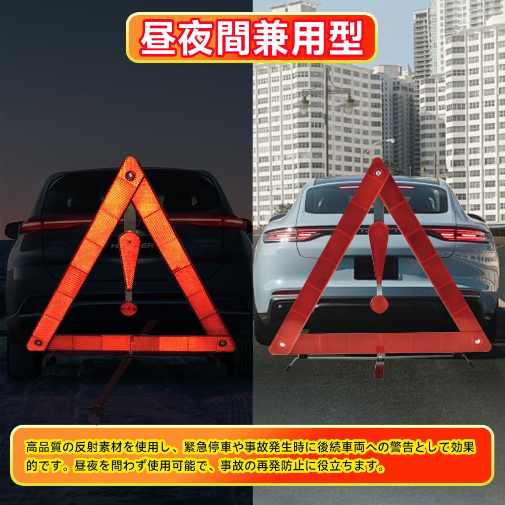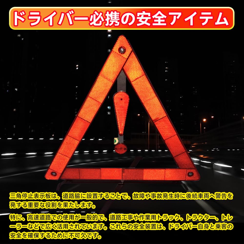 【商品仕様】商品サイズは40cm×40cm×30cm、重さは約368gです。三角表示板1個と専用の収納ケース1個が付属しており、昼夜を問わずご使用いただけます。 【昼夜間兼用型】高品質の反射素材を使用し、緊急停車や事故発生時に後続車両への警告として効果的です。昼夜を問わず使用可能で、事故の再発防止に役立ちます。 【コンパクトな収納設計】三角表示板の接合部には金属リベットを使用しており、耐久性に優れています。また、道路面と接する部分には滑り止め加工が施されているため、冬季でも安心して使用できます。折りたたみ式でコンパクトに収納可能なデザインで、トランクルームに収納しても場所を取らず、持ち運びにも便利です。 【優れた耐久性】高品質な素材を使用した警告三角形は、厳しいテストに合格し、強風や悪天候にも耐える設計です。接合部は金属リベットで固定されており、耐久性が高く、長期間の使用でも安心です。これらの特長により、風や悪天候の中でも安定して使用できます。 【ドライバー必携の安全アイテム】三角停止表示板は、道路脇に設置することで、故障や事故発生時に後続車両へ警告を発する重要な役割を果たします。特に、高速道路での使用が一般的で、道路工事や作業用トラック、トラクター、トレーラーなどで広く活用されています。これらの安全装置は、ドライバー自身と乗客の安全を確保するために不可欠です。