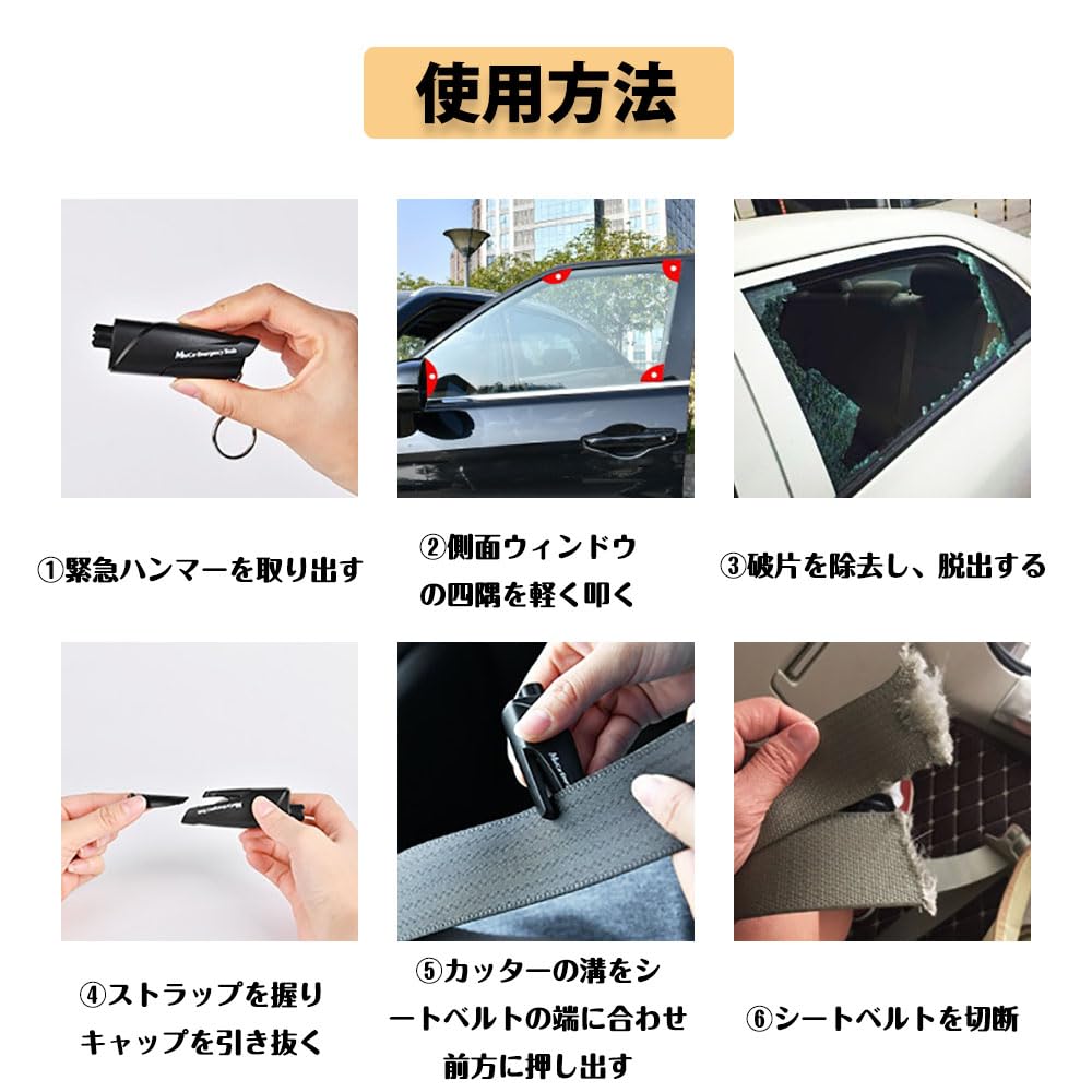 【高品質素材】高品質の合金素材を採用した鋭い先端が飛び出し、ガラスが粉々に粉砕できます。爆発力が強くて、緊急時に1秒脱出できます。鋭利な刃で、シートベルトが外せない時に、簡単に切られます。
