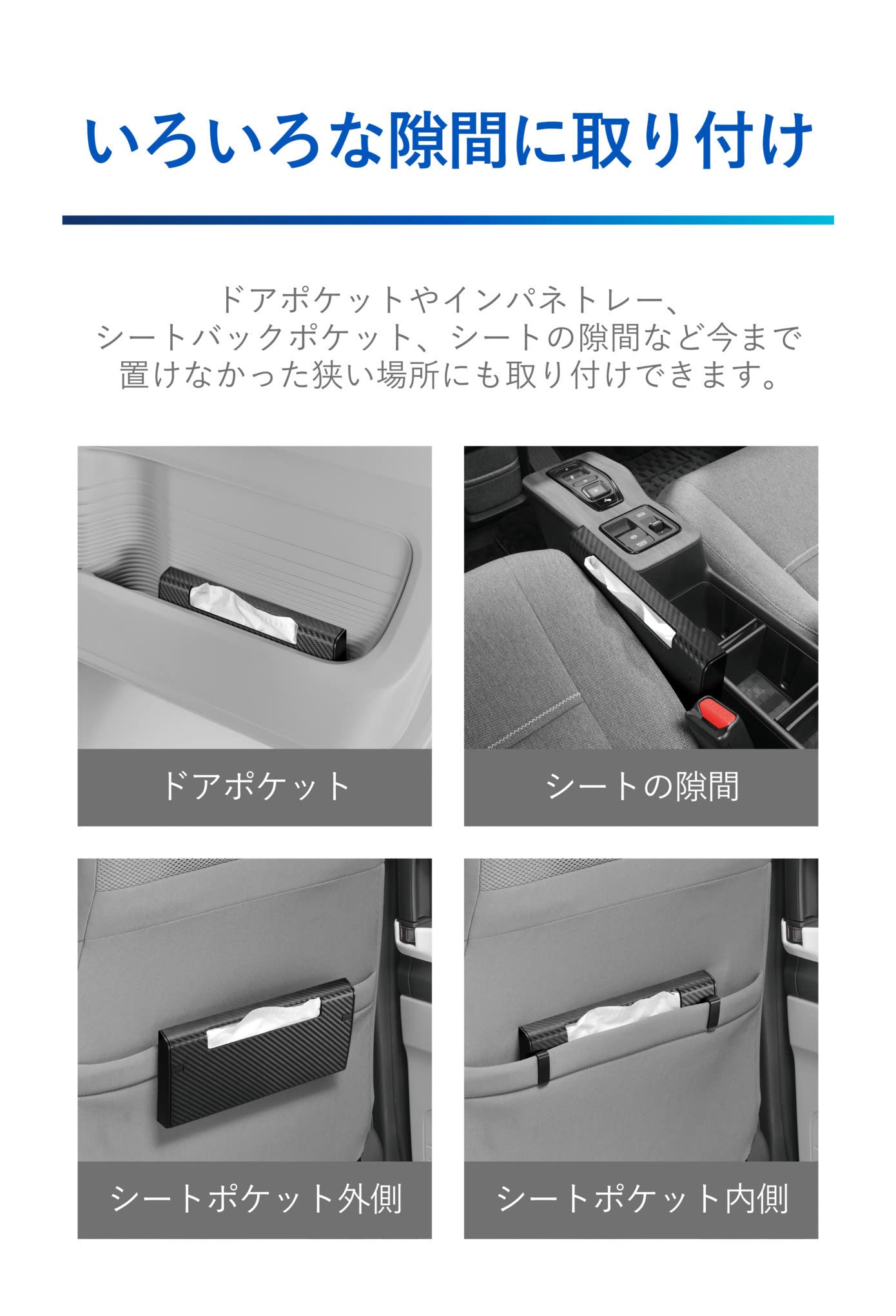ドアポケットやインパネトレー、シートバックポケット、シートの隙間など今まで置けなかった狭い場所にも取り付けできます。