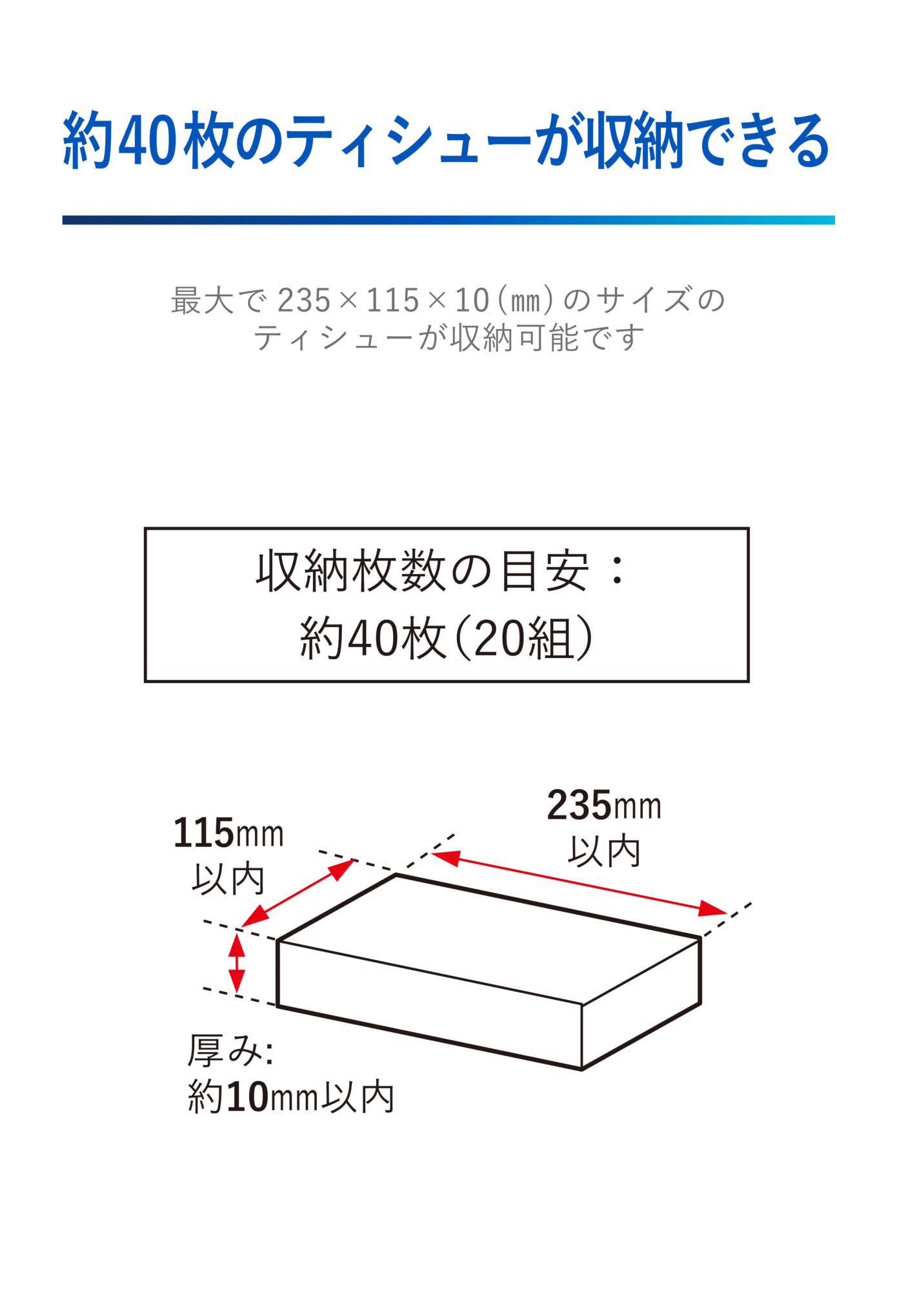 約40枚(20組)のティシューを入れることができます。
