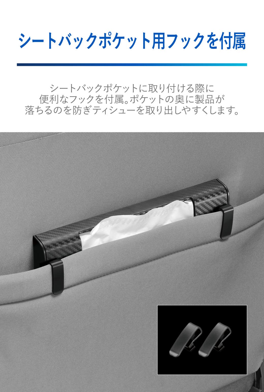 ●シートバックポケット用フックを付属 シートバックポケットの内側・外側に取り付ける際に便利なフックを付属。ポケットの内側に装着する場合は、製品をフックで引っ掛けることで、ポケットの奥に製品が落ちるのを防ぎ、ティシューを取り出しやすくします。