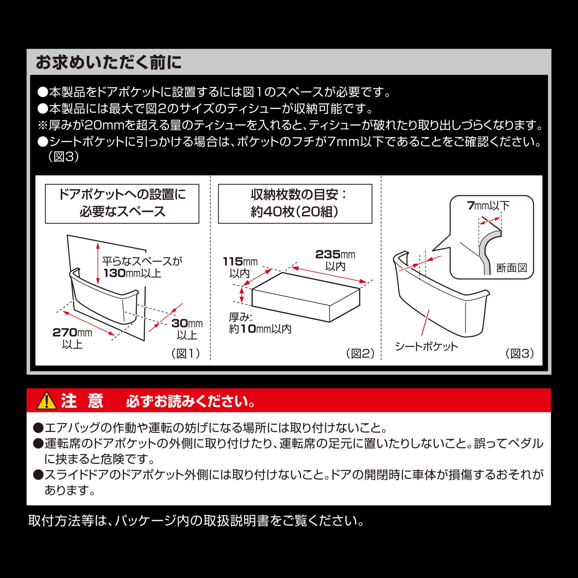 ・エアバッグの作動や運転の妨げになる場所には取り付けないこと。 ・運転席のドアポケットの外側に取り付けたり、運転席の足元に置いたりしないこと。誤ってペダルに挟まると危険です。