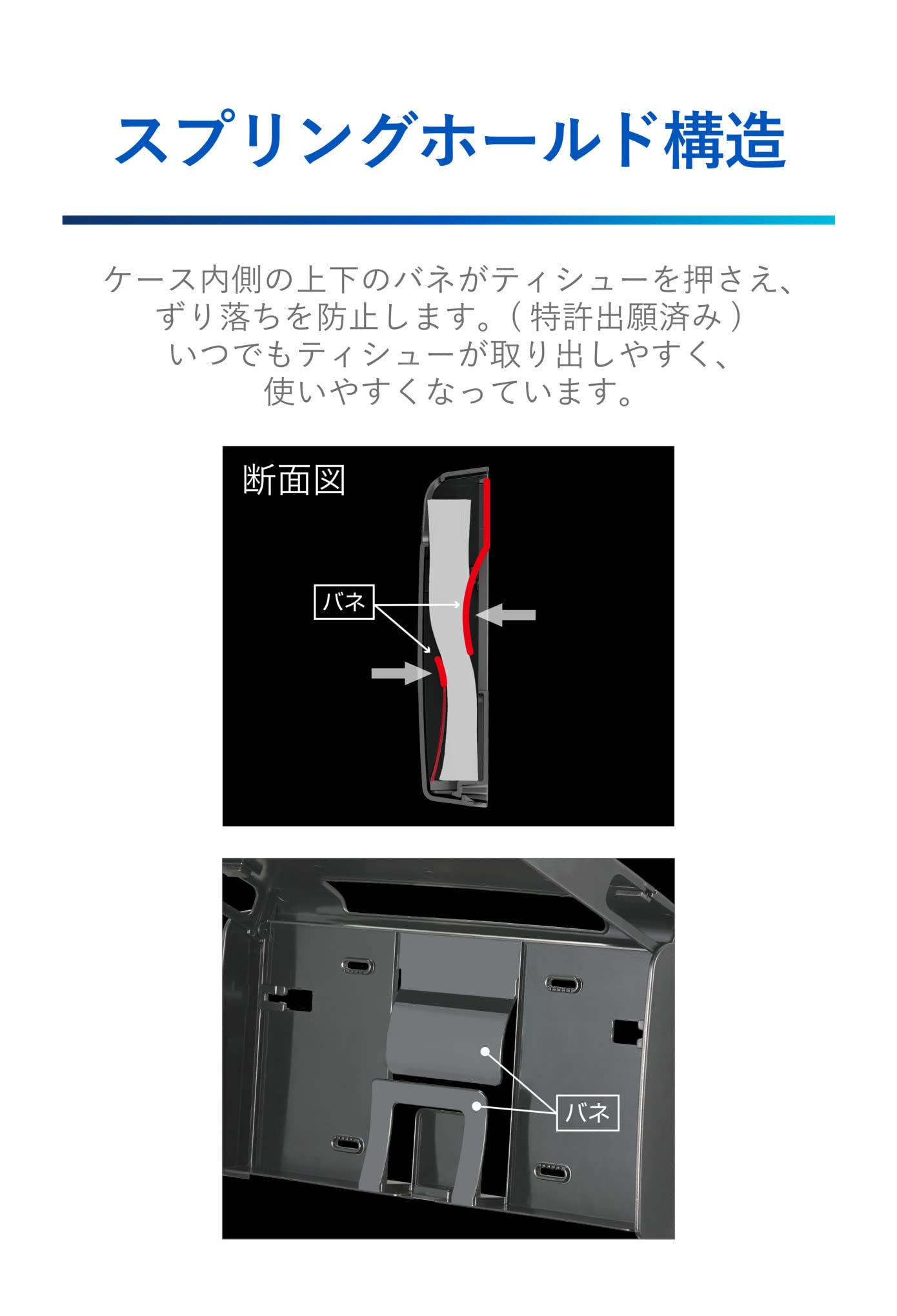 【ティシューが少なくなっても取りやすい】ケース内側の上下のバネがティシューを押さえ、ずり落ちを防止します。(特許出願済み)そのため、ティシューの枚数が少なくなっても取り出しやすく、使いやすいです。