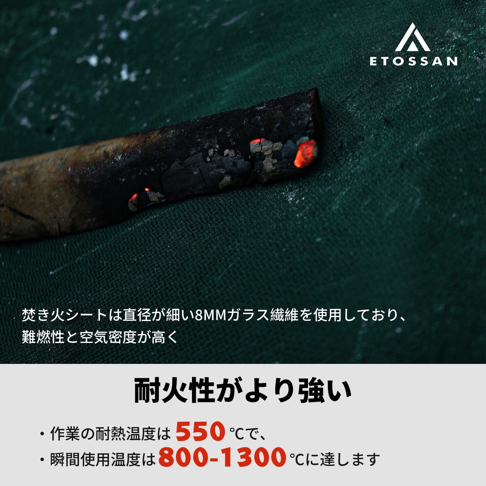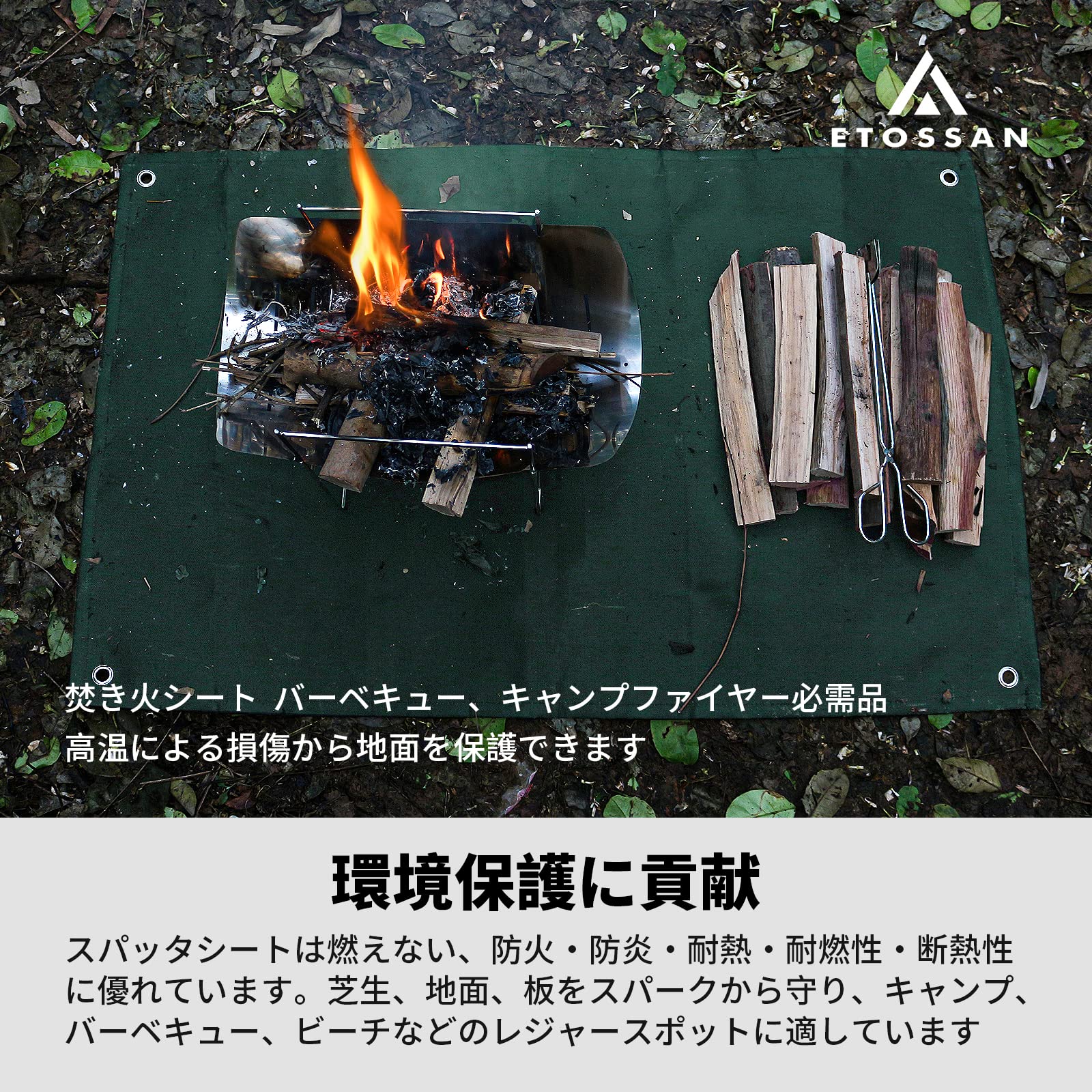 【使用方法】この製品は耐火耐熱のシートであり、断熱シートではありません。高温の物体をテントシートに置くと、熱がテントシートを通じて地面に伝わる可能性があります。火花が飛び跳ねるのを防止するためのツールとして使用してください。一般的に、ガラス繊維製の焚き火シートは、地面が飛び散る火花を短時間加熱し、火災の蔓延を防ぐことができますが、焚き火台から放射される持続的な熱は地面に伝わります。地面や芝生を保護するために、焚き火台と焚き火シートの間に、火床や地面から20cm以上離れた物体、湿った木材などの断熱性のある物体を置いてください。