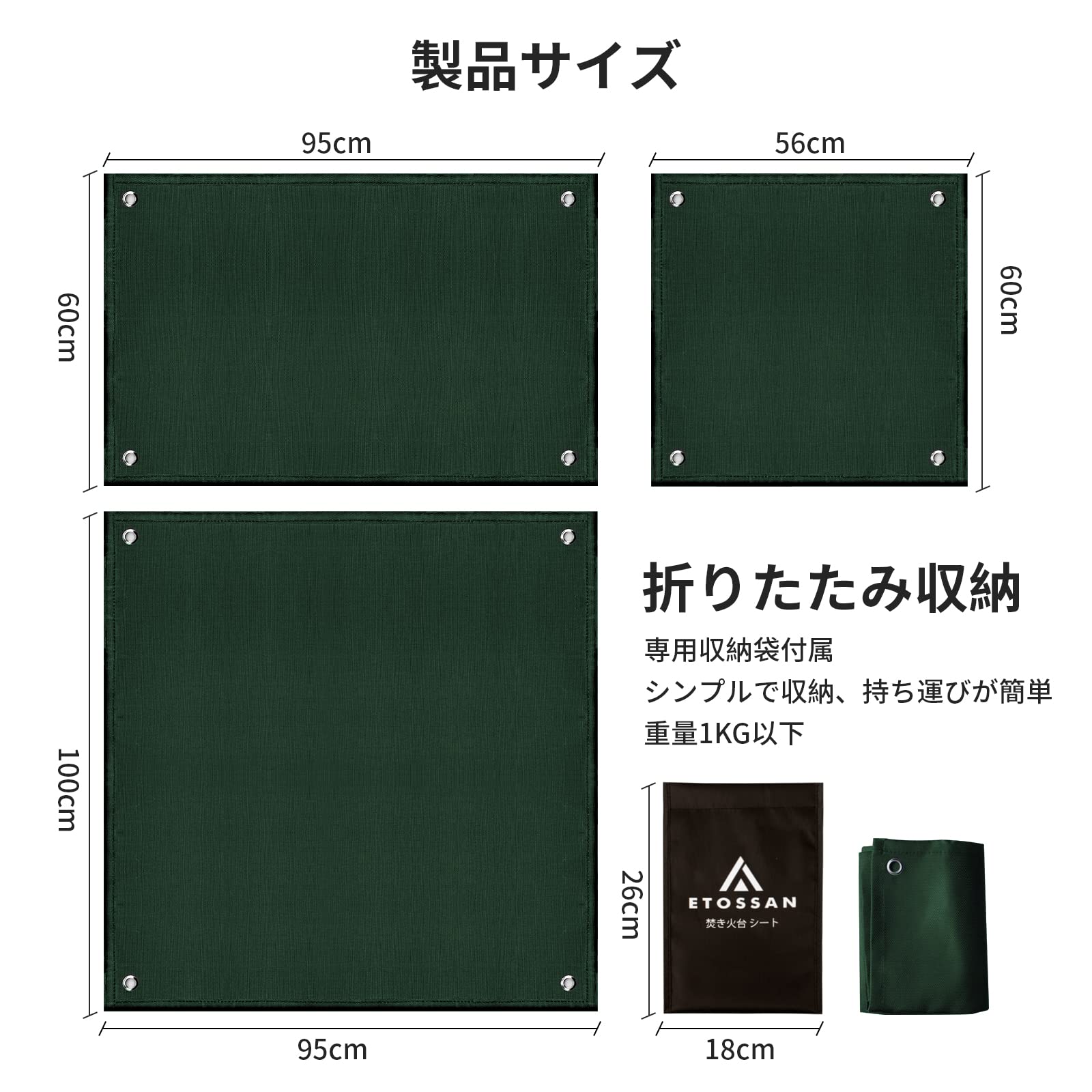 【さらに多くのサイズ選択肢】不燃シートは縫い目が密着しており、56×60cm、60×95cm、95×100cmの3種類のサイズがあります。焚き火シート、耐?シート、防火シート、薪シートなどのベースシートとして使用でき、ユーザーは必要に応じてサイズを選択できます。また、折りたたみ可能で携帯に便利で、収納袋が付属しています。