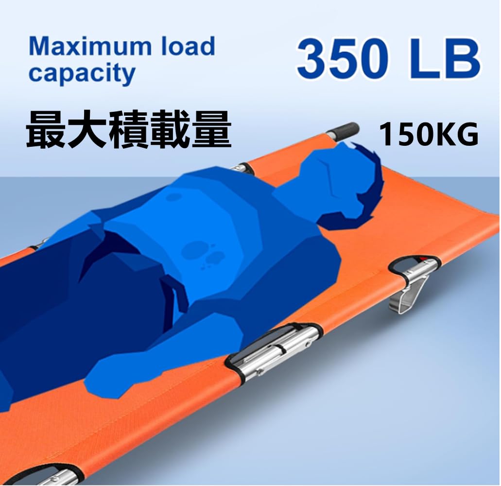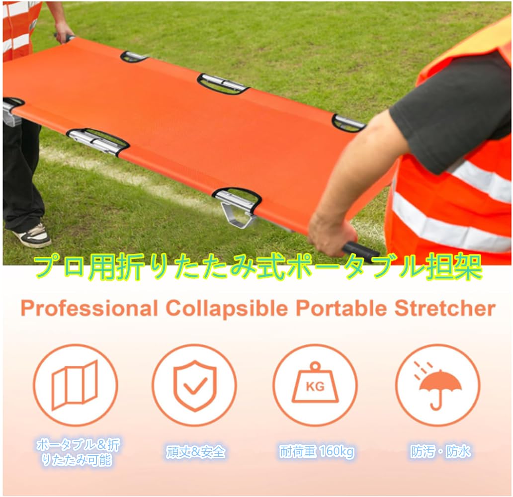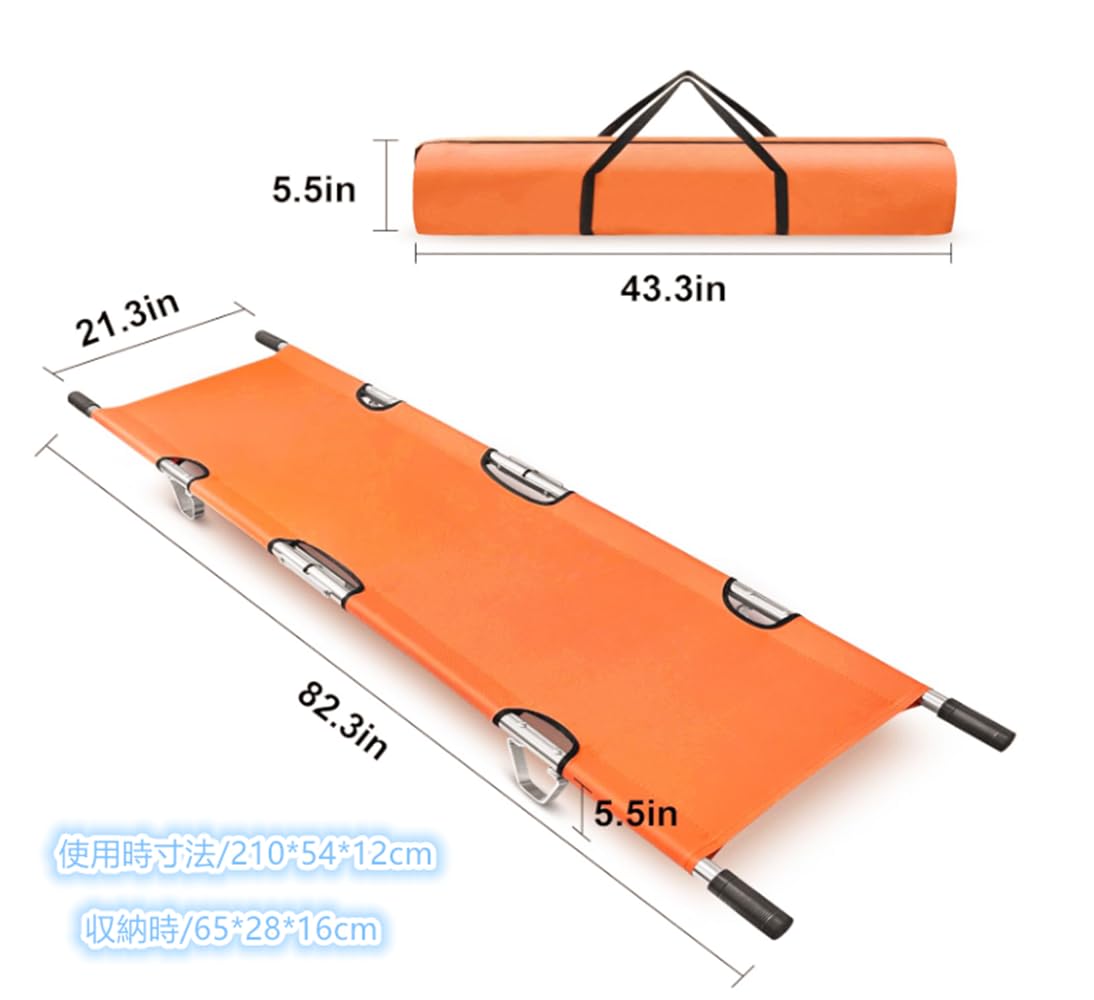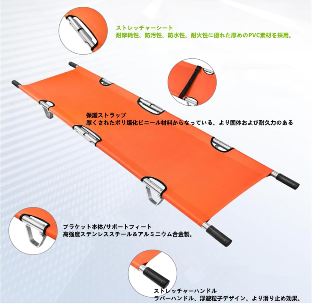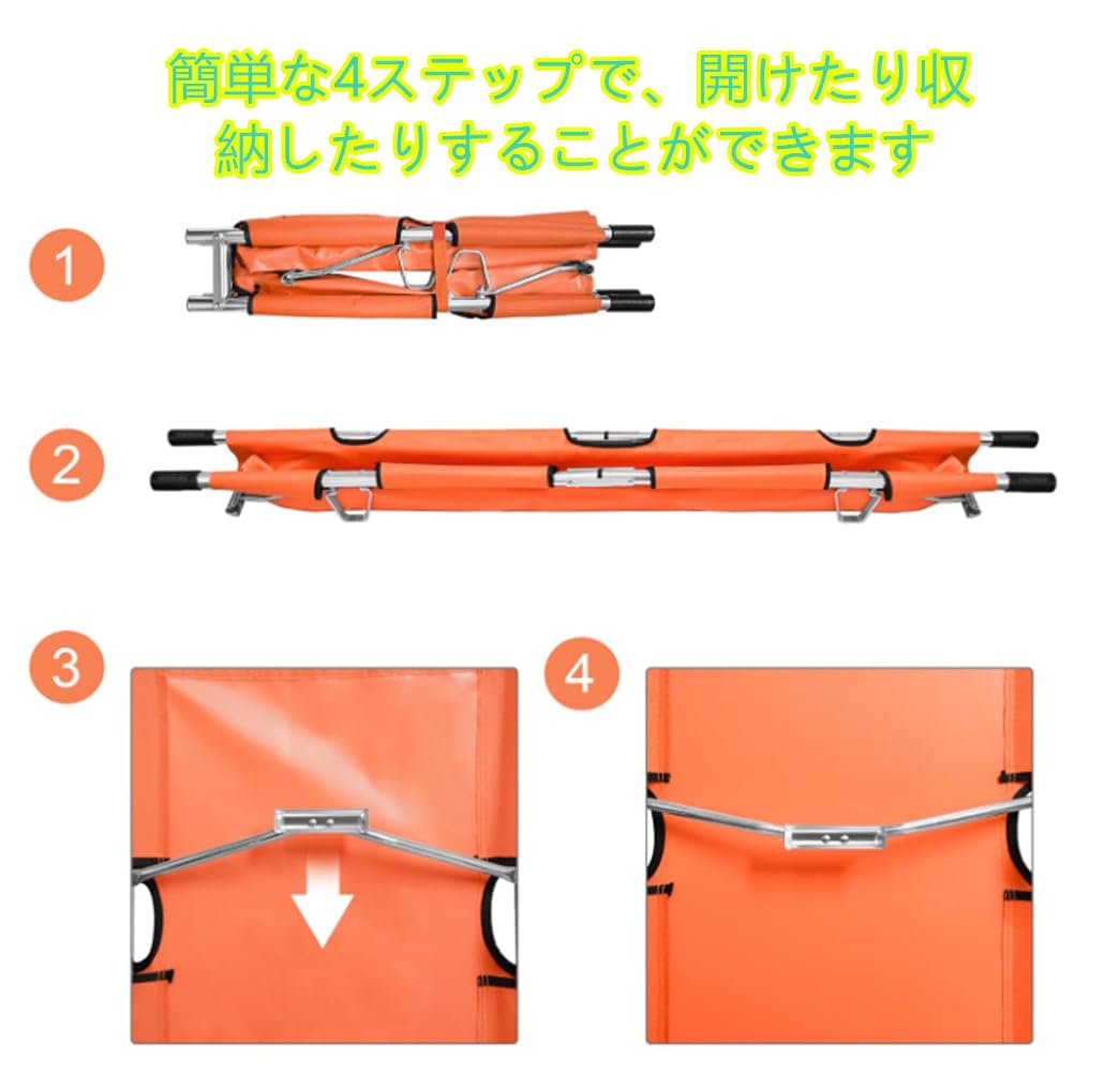 折りたたみ 担架 スチール製 ロングサイズ 防水 簡易担架 コンパクト 2つ折り ストレッチャー キャスター ベルト付き 救護用 搬送 介護用品 緊急 非常用 搬送 ベルト付 福祉 施設 老人ホーム コンパクト 介助用 簡易 滑り (A-orange)