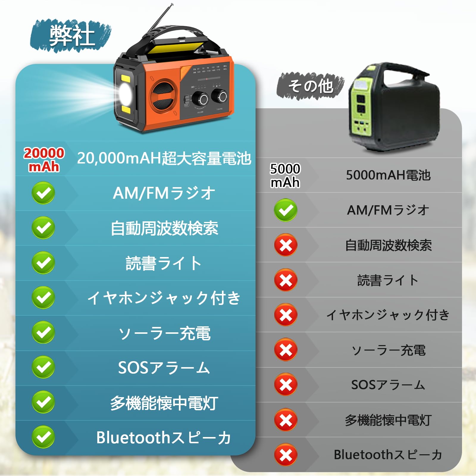 【多機能携帯ラジオ&コンパクトな携帯ラジオ・コンパクト】①SOSアラーム機能 ②モバイル電源 ③懐中電灯 ④読書用LEDライト ⑤AM/FM防災ラジオ ⑥コンパス ⑦Bluetooth対応。手に掛ける紐がついて、持ち運びしやすく、カバンにかけて緊急時に簡単に使用可能です。