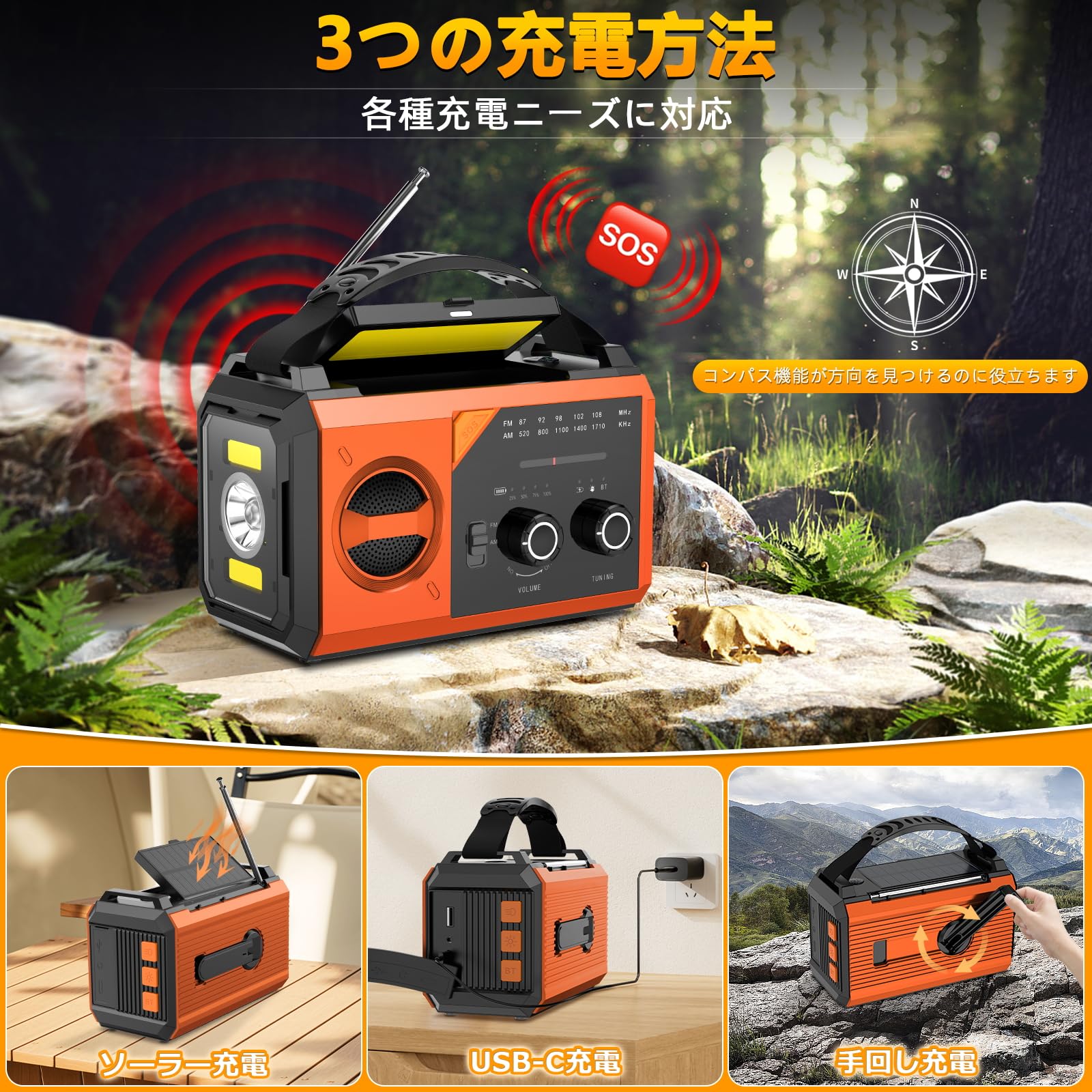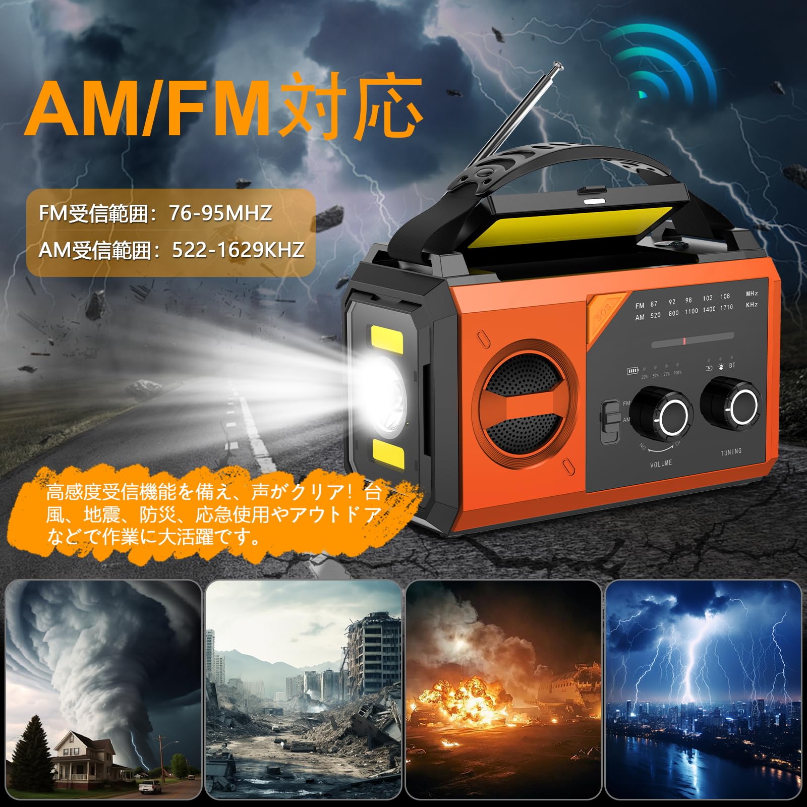 【FM / AM高感度受信&SOSサイレン】FM受信範囲:76-95MHZ AM受信範囲:522-1629KHZ。インタ一ネットやTVがつながらない時の行政放送や最新ニュースを確実受信、360度回転アンテナ内蔵&高感度チューニングで、山間部や地下でもクリアな音声を確保。このFM / AMラジオにはSOS警報機能も搭載し、大音量警報が救助員に位置を知らせるのに役立ちます。