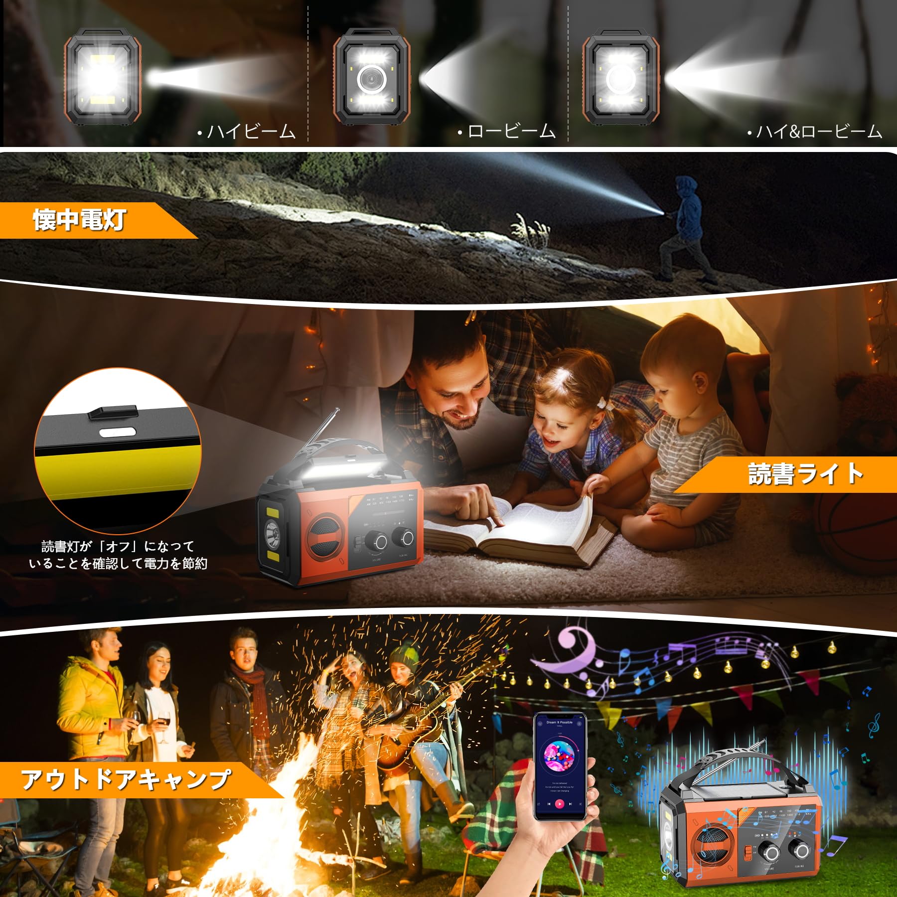 【3つ明かりのLED懐中電灯&読書ライト】この多機能防災ラジオは懐中電灯として使って「ハイビーム、ロービーム、ハイ&ロービーム」という3つモードがあります。さらに、最大58時間連続点灯(ハイビーム時)を実現し、長期停電時でも光を確保。読書灯としても活用できる柔らかな補助照明付き、夜の読書、夜間で車の修理、夜釣り、夜にランニング、キャンプなどの場合で作業に大活躍です。