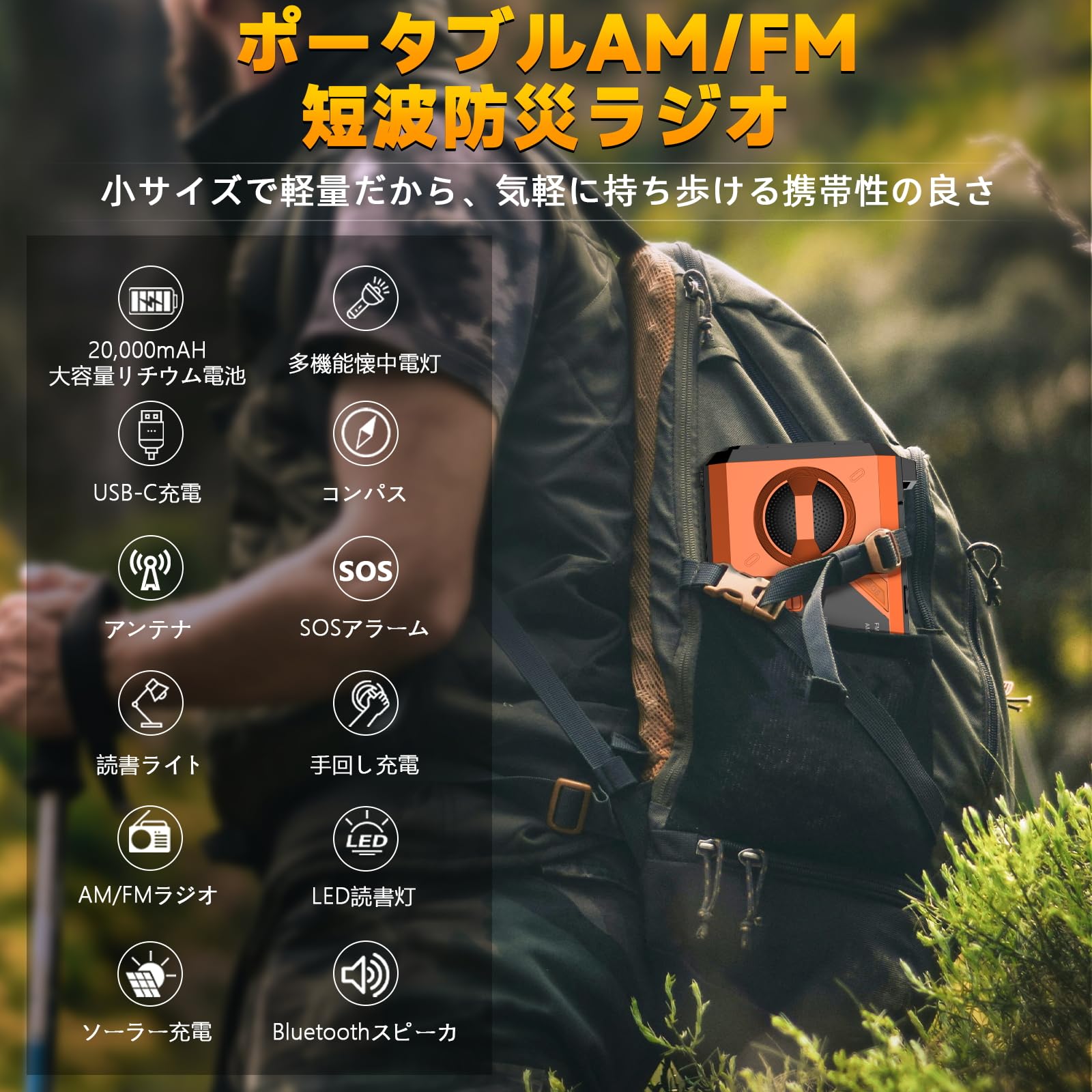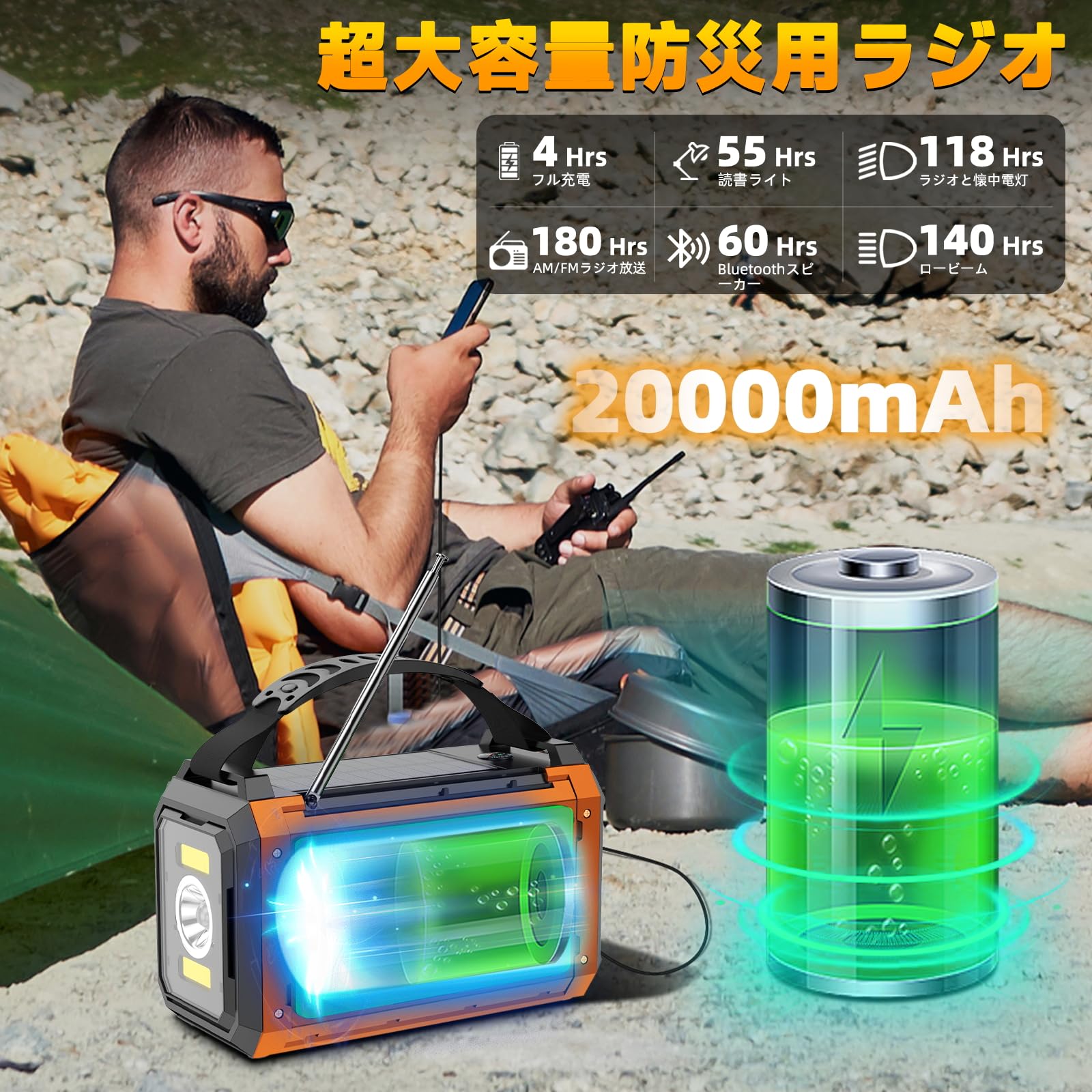 【20000mAhバッテリー付き】防災ラジオ 充電式 5V 3Aスマホに快速充電可能 防災ライト Bluetooth 付き 防災ライト (オレンジ)