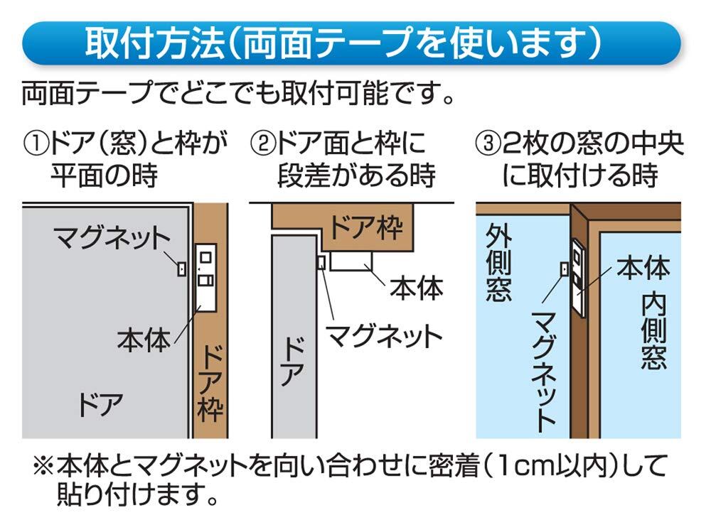 貼りつけ箇所のほこりなどをふき取り、テープで固定ください。ドアの開閉時に接触しないよう取付けください。