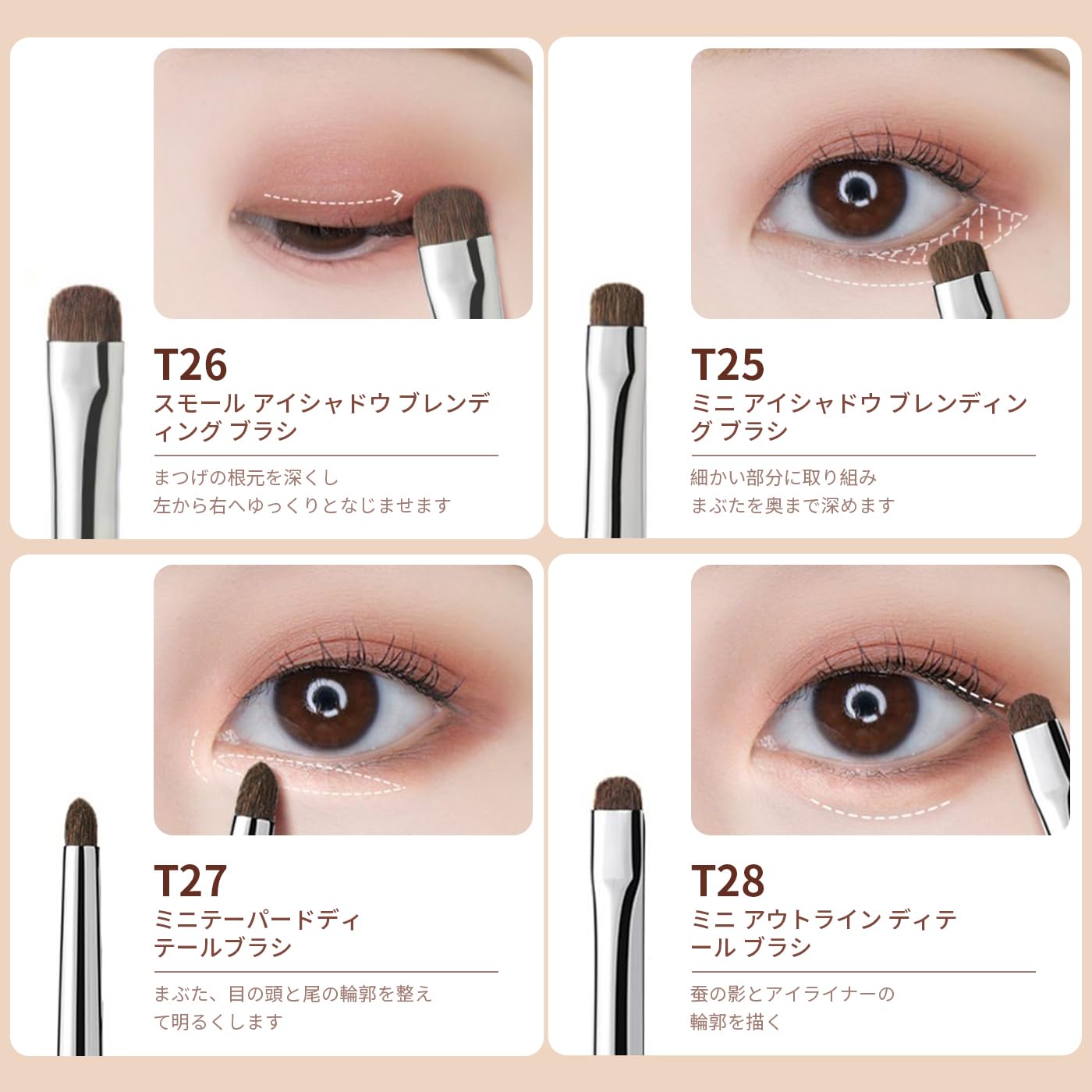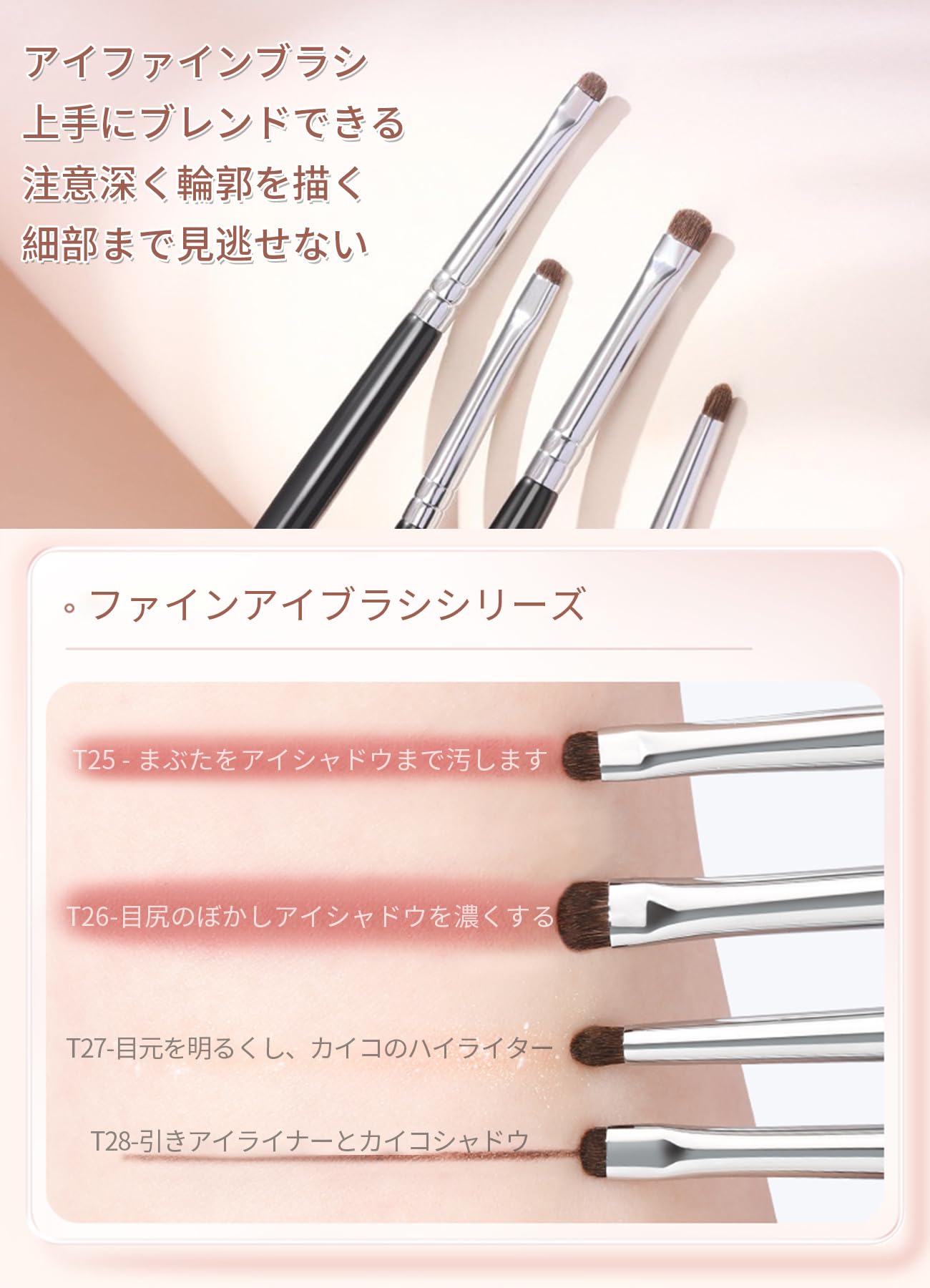 合計4本の極細アイブラシがあり、目の下、目尻、目頭、蚕を丁寧に描くことができ、豊富な機能で毎日のアイメイクに対応し、立体的な3Dアイメイクを作ることができます。