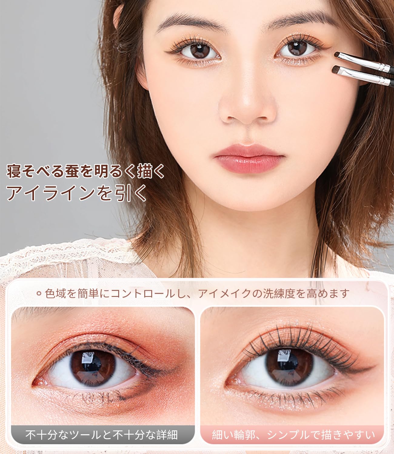 通常のアイシャドウブラシは、アイメイクのディテールを描くには大きすぎるため、このような極細のアイディテールブラシが必要であり、より繊細なアイメイクを描き、細い線の輪郭を描き、自然な表情を表現することができます。