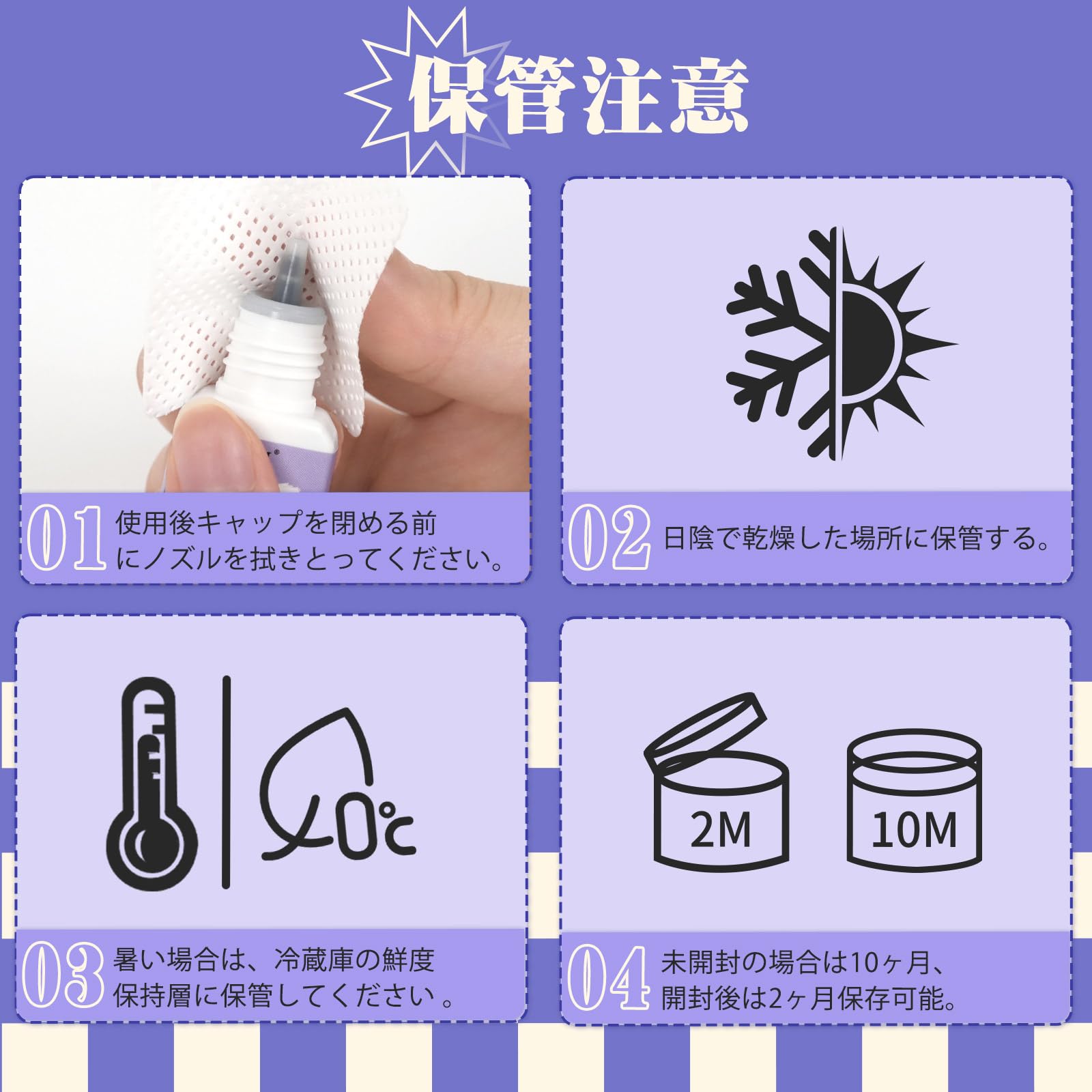 劣化防止:開封後は遮光ボトル(18〜23℃)に入れて冷蔵保存してください。使用期限は2ヶ月です。ノズルの残留物を拭き取るだけで、簡単に劣化を防ぐことができます。