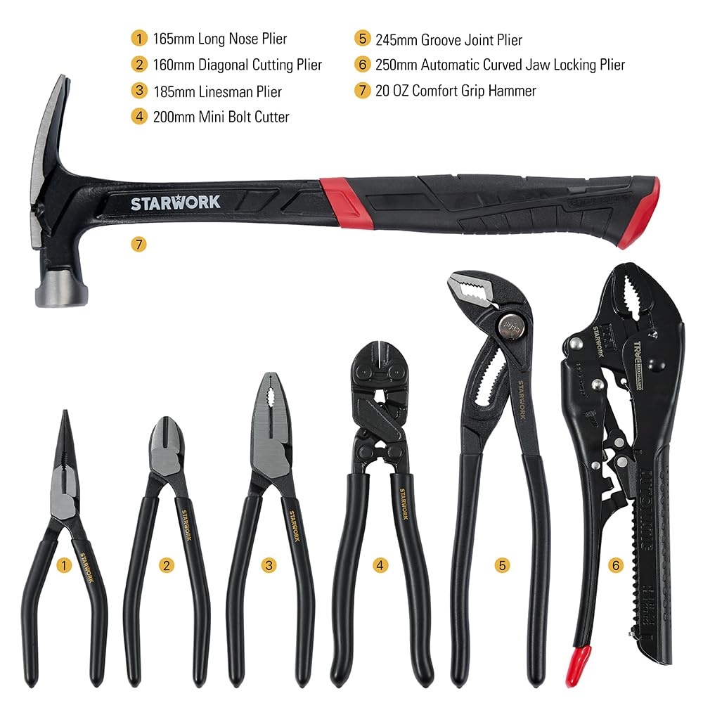 【一つで全てが揃うセット】このセットには、7インチのラインマンプライヤー、6インチの対角カットプライヤー、6インチのロングノーズプライヤー、10インチの自動曲がりジョー・ロッキングプライヤー、10インチのウォーターポンププライヤーが含まれています。機能性がより包括的で、さまざまな状況での使用に適しており、整備工具に必要な全てが揃っているため、作業を効率的に進めることができます。