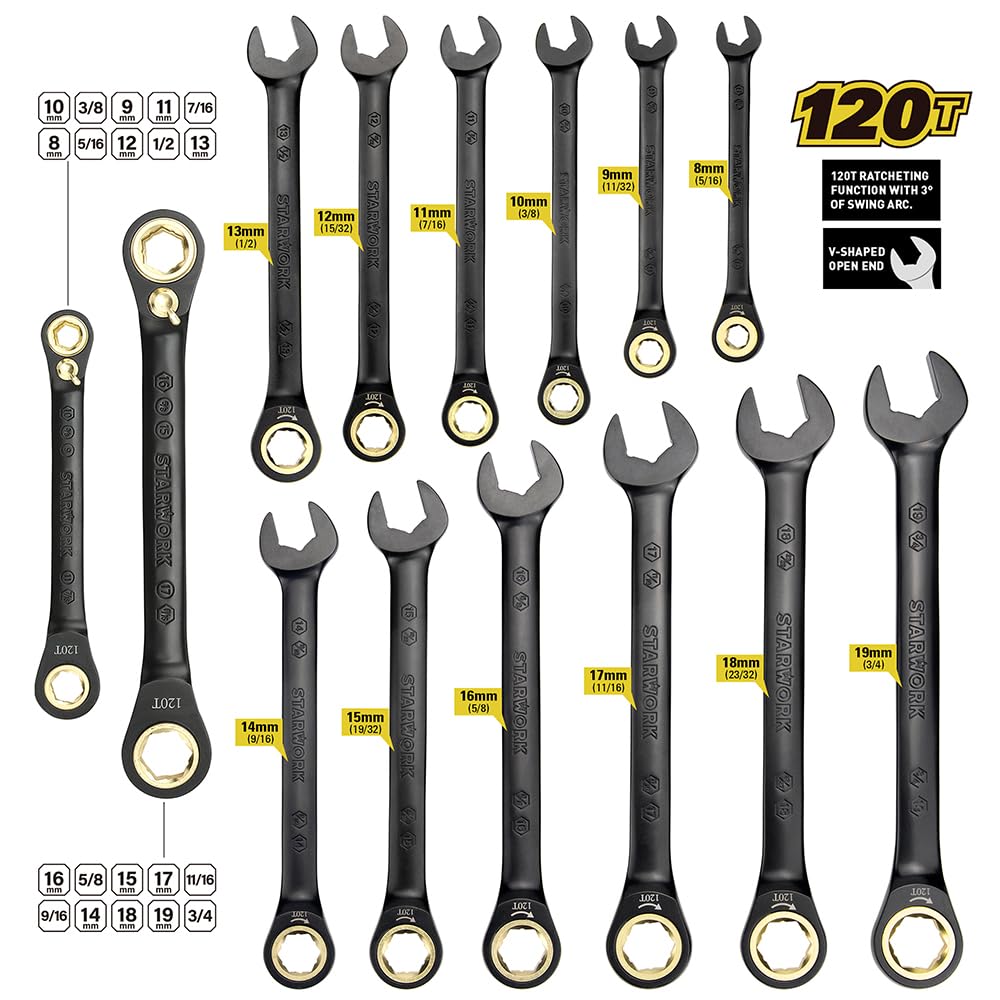 【120T ラチェット 2-IN-1 チェットレンチ】120T ラチェット機能は、わずか 3 度のスイングアークでスムーズに動作します。また、2-IN-1 の SAE とメトリックデザインにより、必要なサイズをカバーしながら、少ないレンチで済むため、コスト効率が高く、設定の種類が2倍になります。