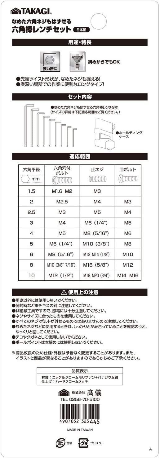高儀(Takagi) なめた六角ネジもはずせる六角棒レンチセット ロングタイプ 9本組 光沢仕上げ