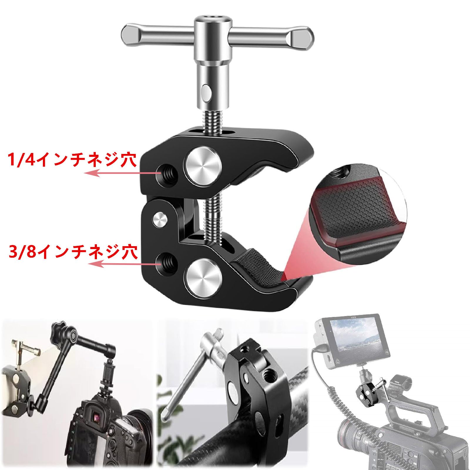【多機能ネジ穴】パイプクランプは1/4インチネジ穴と3/8インチネジ穴があり、各種アタッチメントを取り付けることができます。例えば、ヘッドを固定してLEDライト、アクションカメラ、マイクを接続します。