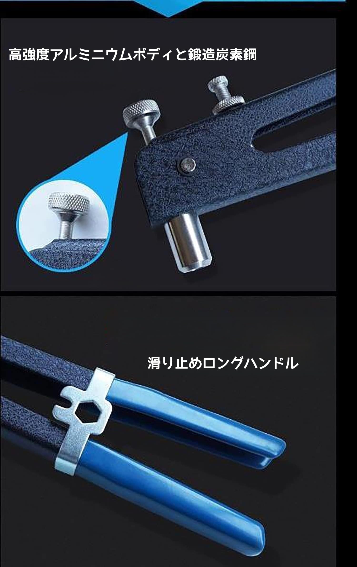 【高品質リベット セット】高強度アルミニウムボディと鍛造炭素鋼ハンドルに、滑り止めのラバーで覆われた使い勝手の良いデザインです。