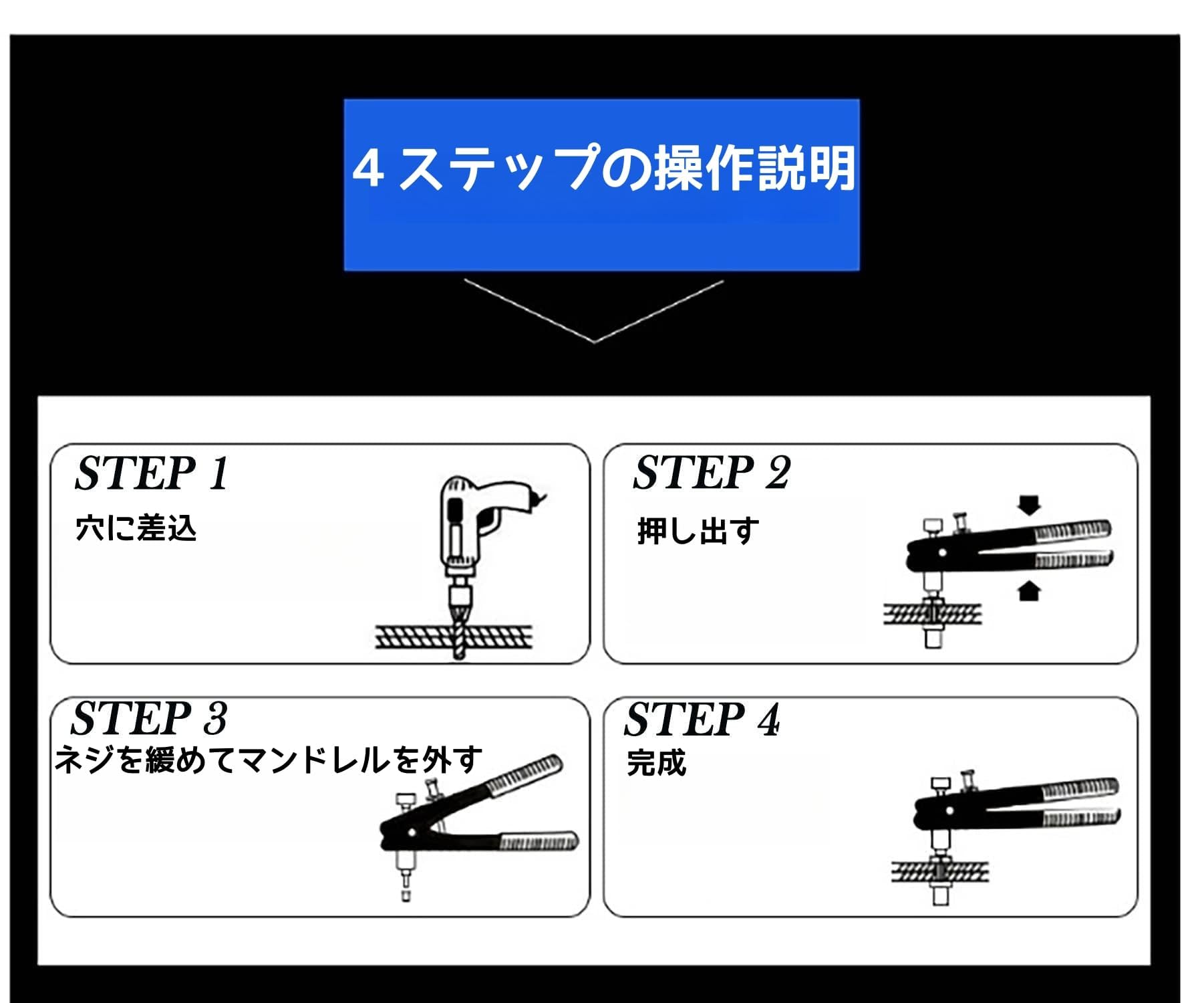 【パッケージ内容】1個ハンドリベッター本体、5種類のM3 M4 M5 M6 M8式シャフト、20個M3ネジ式リベットナットインサート、20個M4ネジ式リベットナットインサート、20個M5ネジ式リベットナットインサート、10個M6ネジ式リベットナットインサート、10個M8ネジ式リベットナットインサート、1個プラスチック収納ケース。