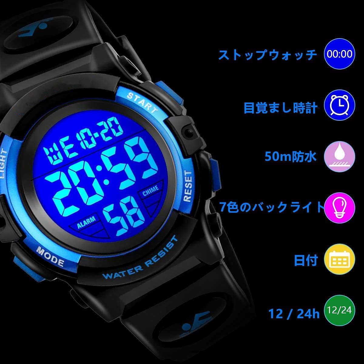 【多機能なキッズデジタルウォッチ】デジタル腕時計は7色のELバックライトディスプレイ、アラームクロック、ストップウォッチ、カレンダー、12 / 24h、曜日、50メートル防水など多くの機能があります。お子様のアウトドアスポーツや日常生活に最適です。