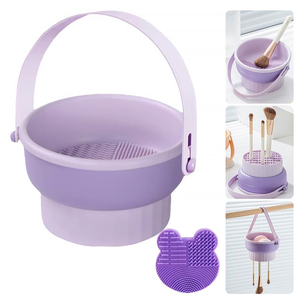 【特価在庫】2点セット メイクブラシクリーナー 化粧ブラシ 洗浄 シリコン シリコン クリーナー 3in1 洗浄 乾燥 収納 おしゃれ ドライクリーニングスポンジ 洗浄カアップ 化粧筆洗浄(パープル)