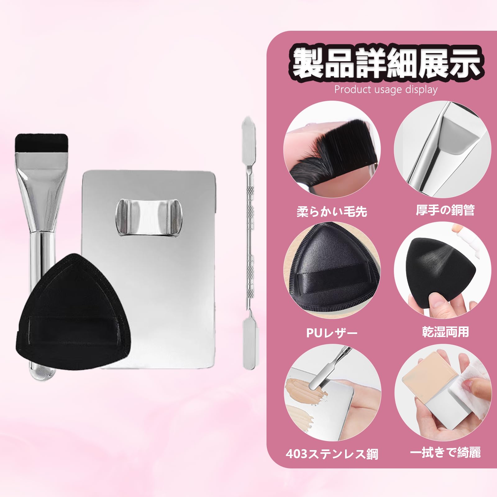 このセットはリキッドファンデーションブラシ、化粧パレット、スパチュラ、化粧スポンジが含まれ、メイクに必要なアイテムが全て揃っており、これ一つで完璧なファンデーションメイクが可能で、高品質の繊維で作られた柔らかく密な毛のブラシは肌に優しくチクチクせず快適に使用でき、敏感肌の方にも安心で、さらに小型で軽量なデザインなのでメイクポーチやバッグに簡単に収納でき、外出先でも手軽に使え、旅行や出張にもぴったりで、ファンデーションが肌に均等に広がり、毛穴を滑らかにカバーし、メイクパレットとスパチュラを使うことで肌色にぴったり合うファンデーションが作れ、完璧な仕上がりが実現し、ファンデーションだけでなくコンシーラーやハイライトにも使用可能で、パウダーも均等にキャッチするため無駄なく使用でき、メイクをよくする方へのプレゼントにも最適です