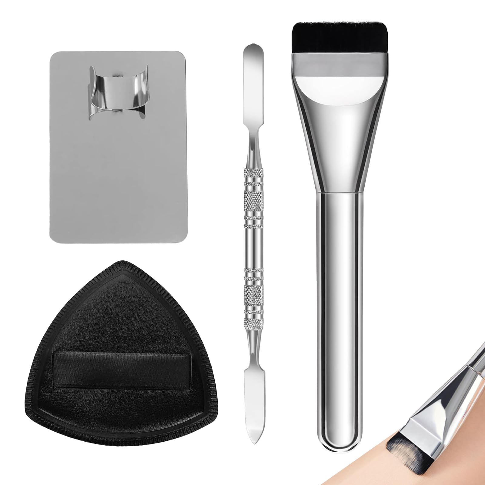 メイクブラシ ファンデーションブラシ 4個セット フラットメイクブラ リキッドファンデーションブラシ 化粧パレット スパチュラ 化粧スポンジ 乾湿兼用 柔軟性と弾力性 全肌質対応 清潔で長持ちし 初心者向け