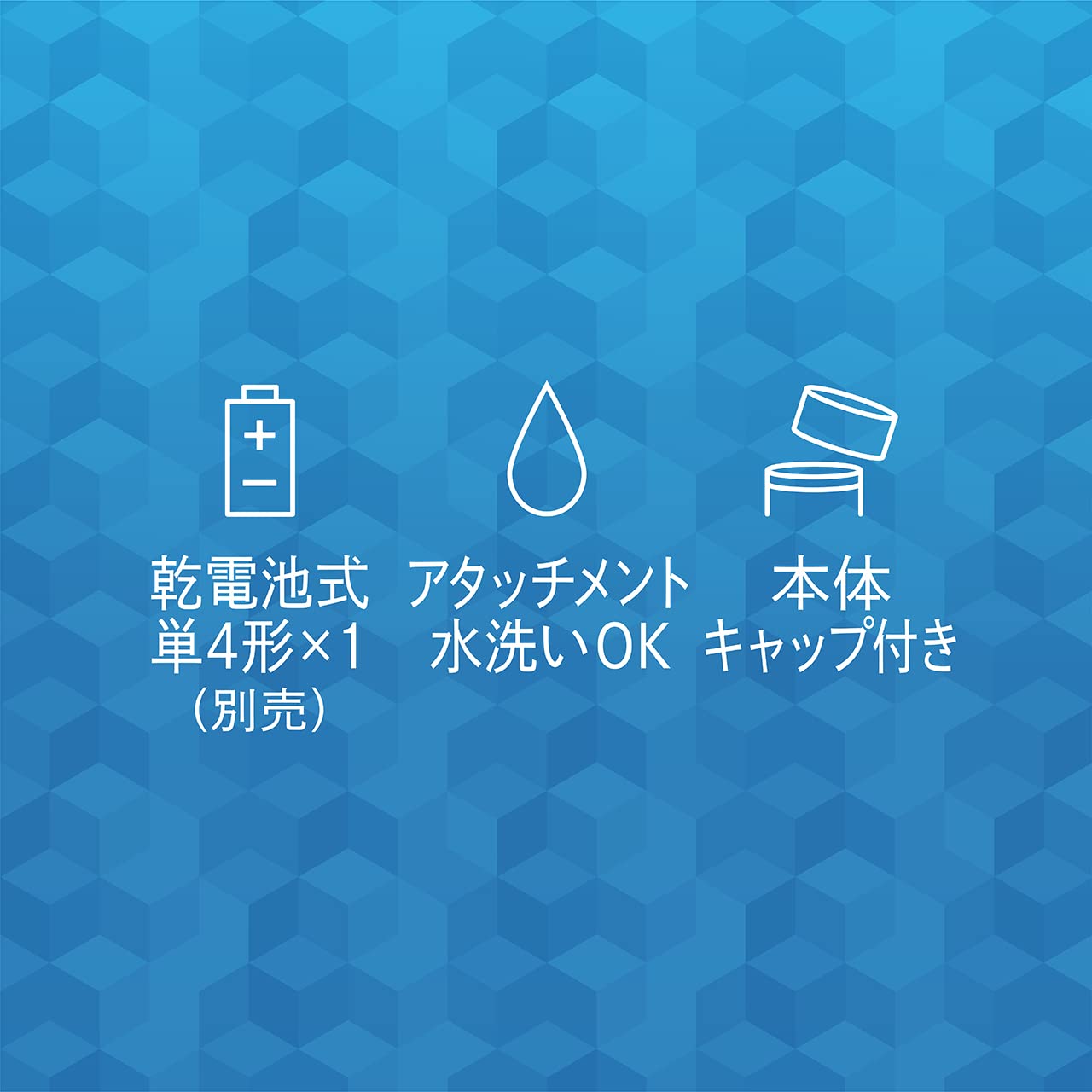 ・電源:DC1.5V 単4アルカリ乾電池1本(別売) ・アタッチメント:ヒゲトリマー、回転式鼻毛カッター、往復式鼻毛カッター ・水洗い:アタッチメントのみ ・付属品:アタッチメント(ヒゲトリマー、回転式鼻毛カッター、往復式鼻毛カッター)、ヒゲ用コーム、キャップ、取扱説明書、書 ・電池寿命(目安):1回5分の使用の場合10回使用可能