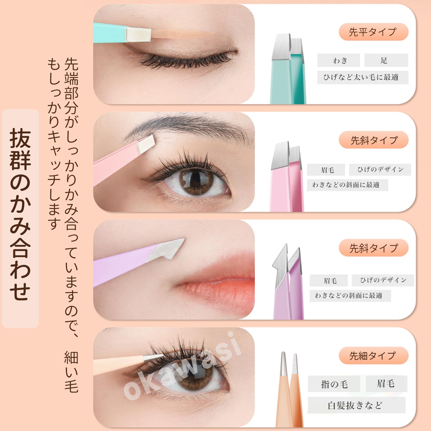 【幅広い用途】さまざまなニーズを満たす平らな、角度の付いた、尖った、斜めのピンセット。 眉、鼻毛、髪、顔に適しています。