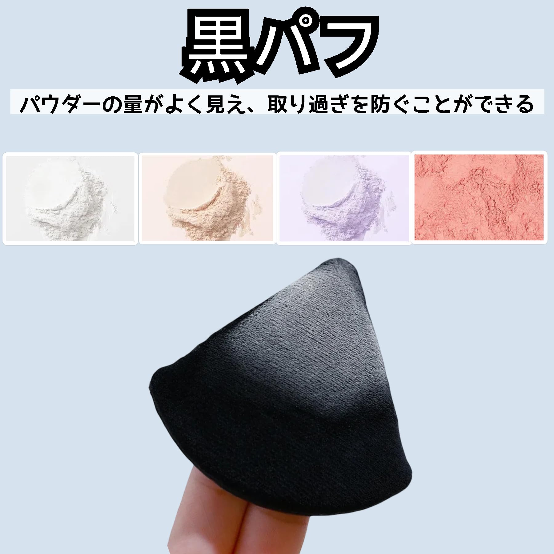 【黒セット&両面利用可能】黒パフを色違いのパウダーと組み合わせることで、パウダーの量がよく見え、取り過ぎを防ぐことができます。また、パフは両面利用可能より効率的に使用できます。