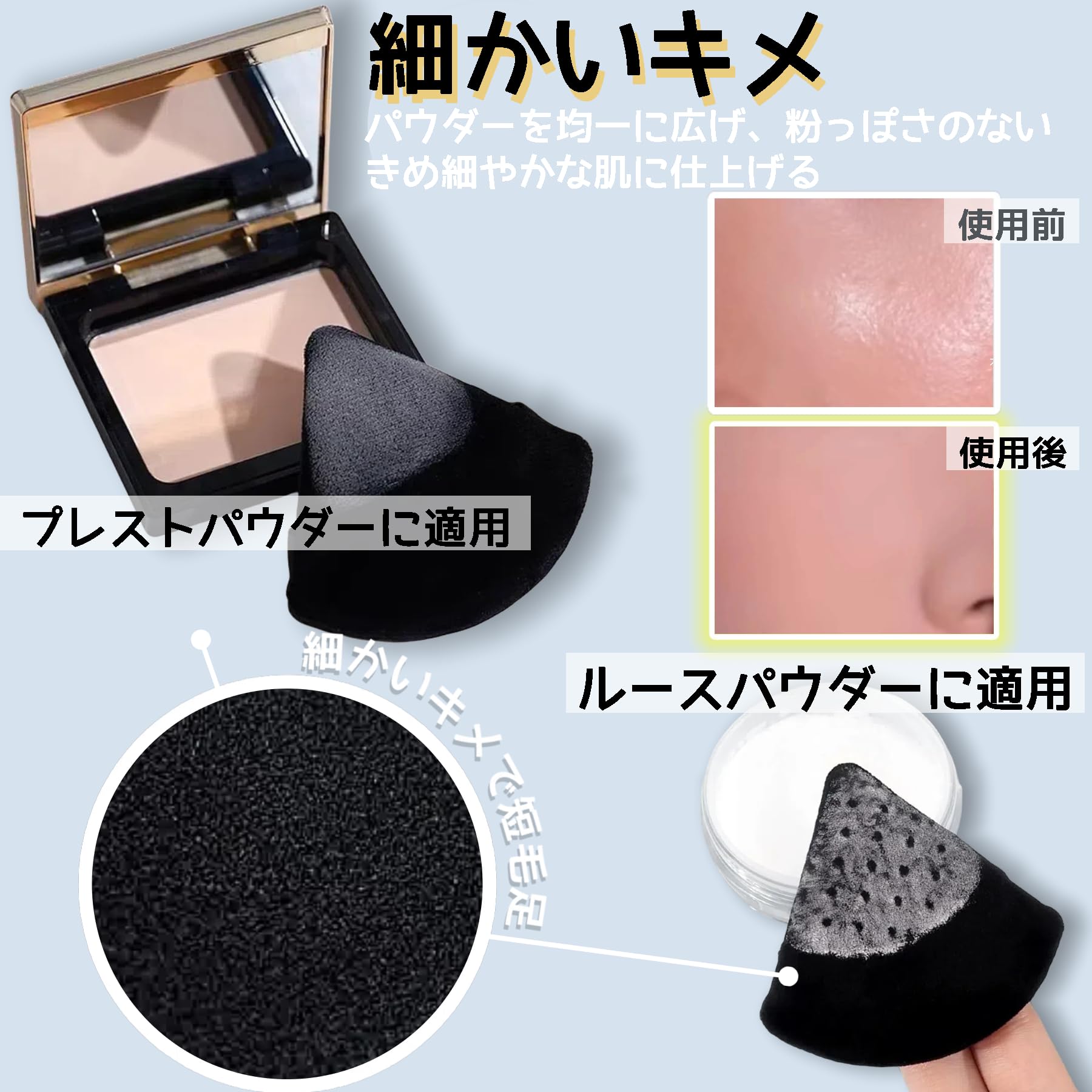 【円形と三角形を組み合わせた2-in-1パフ】パウダーパフの形状は三角形と円形なので、円形側は頬や額のメイクに適していて、三角側は小鼻やロ角の細かいメイクに適しています。