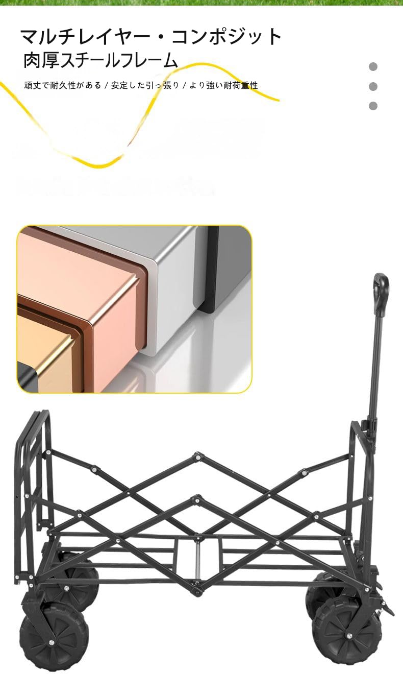 ※ サビに強い無垢のスチール合金を採用し、長く使用でき、キャリーカートを頻繁に使用する方に適しています。 二重構造の600Dナイロン生地を採用し、破れにくく、耐水性に優れ、アウトドア活動に適しています。フレームは「X」交差構造で、走り出すと120kgの重りを積んでいるとは思えないほど軽快に動き、左右に揺れることなく安定した走行が可能です。