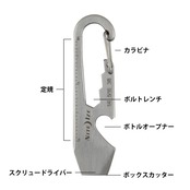 ・ドゥーヒッキーシリーズのファーストモデル ・手のひらサイズ小さな本体の中に5つの機能を備えた、持っているといざという時便利なマルチツール ・5つの機能:1ボトルオープナー 2ボックスカッター 3スクリュードライバー 4ボルトレンチ 5定規 ・カラビナクリップ付きで、日常で使うカバンの中や防災袋・非常用バッグに入れておけば安心 ・サイズ:W18xH66xD3mm ・重量:11g ・材質:ステンレススチール