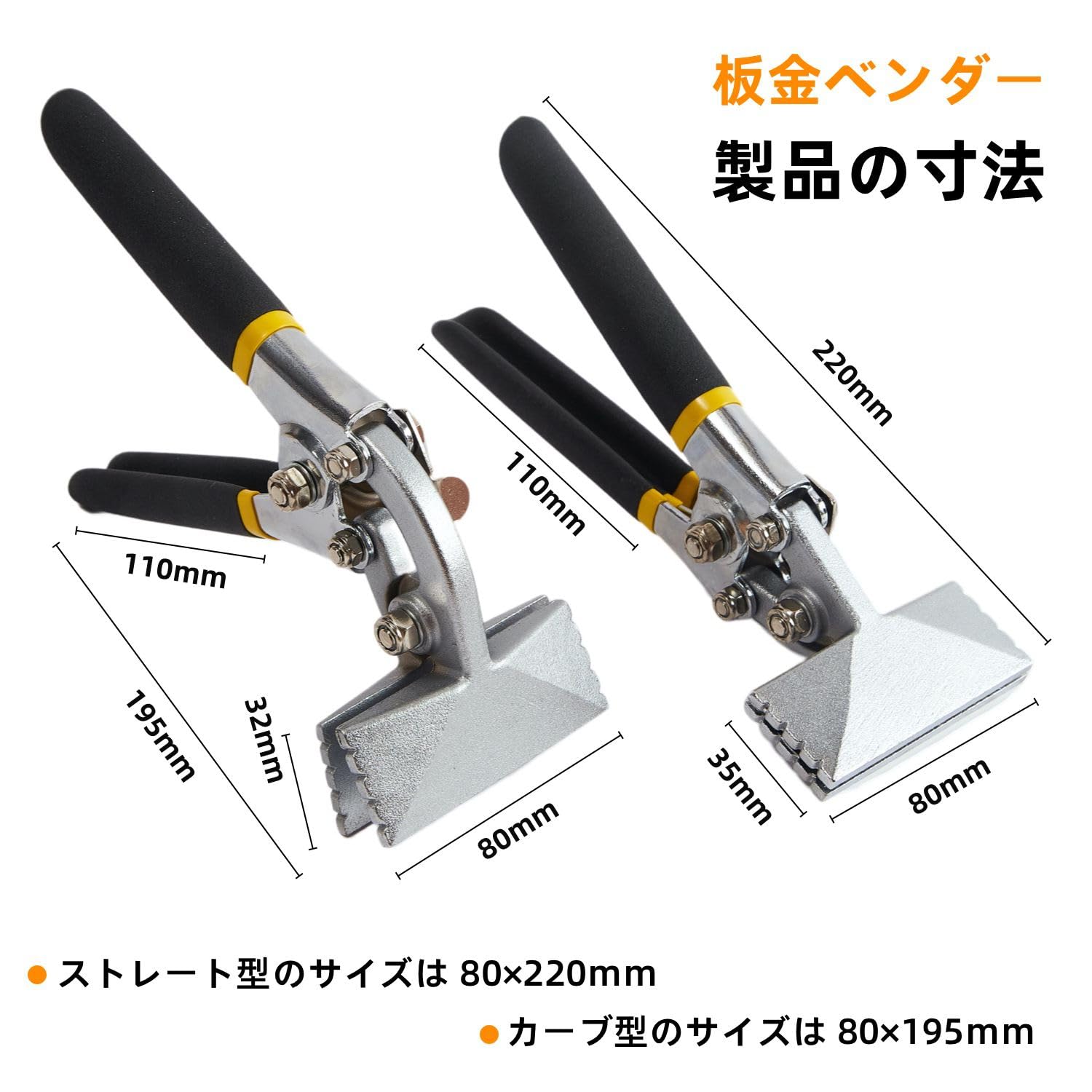 【サイズ】ストレート型のサイズは80×220mm、カーブ型のサイズは80×195mmです。このハンドシーマープライヤーは、板金を折り曲げるためのツールです。ストレートとカーブの2種類があります。