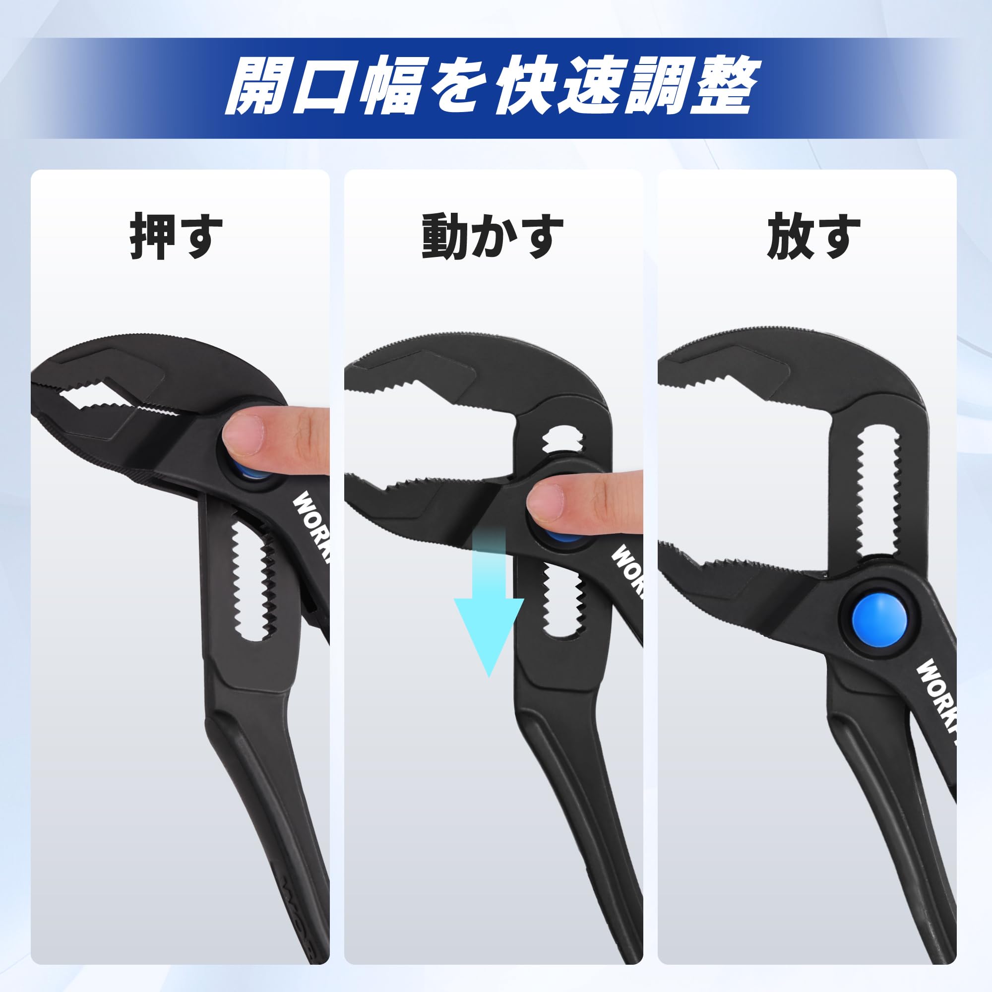 【特価】WORKPRO ウォータポンププライヤー ミニウォータープライヤー 全長108mm 最大開口25mm クイックリリース調整タイプ リン酸処理